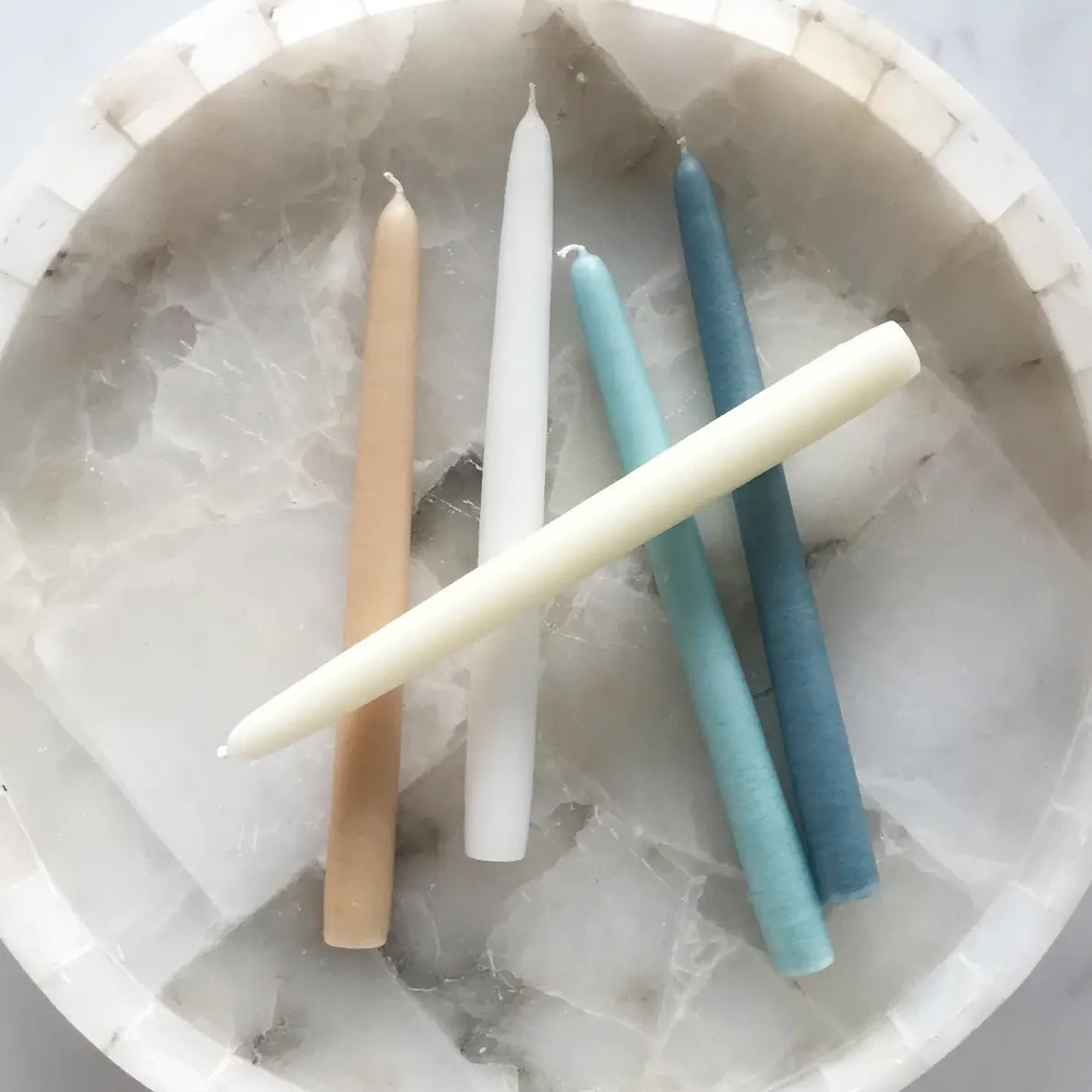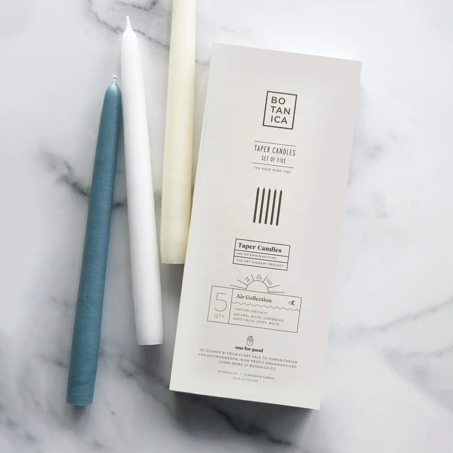 Botanica taper candles are dipped over 20 times by hand, creating the ideal taper–dripless and smokeless–perfect for dinner parties and creating warm, homey ambiance. Our Zodiac Tapers are slightly textured for a handmade finish, and beautifully dyed in an array of shades reflecting the Elemental Collection.