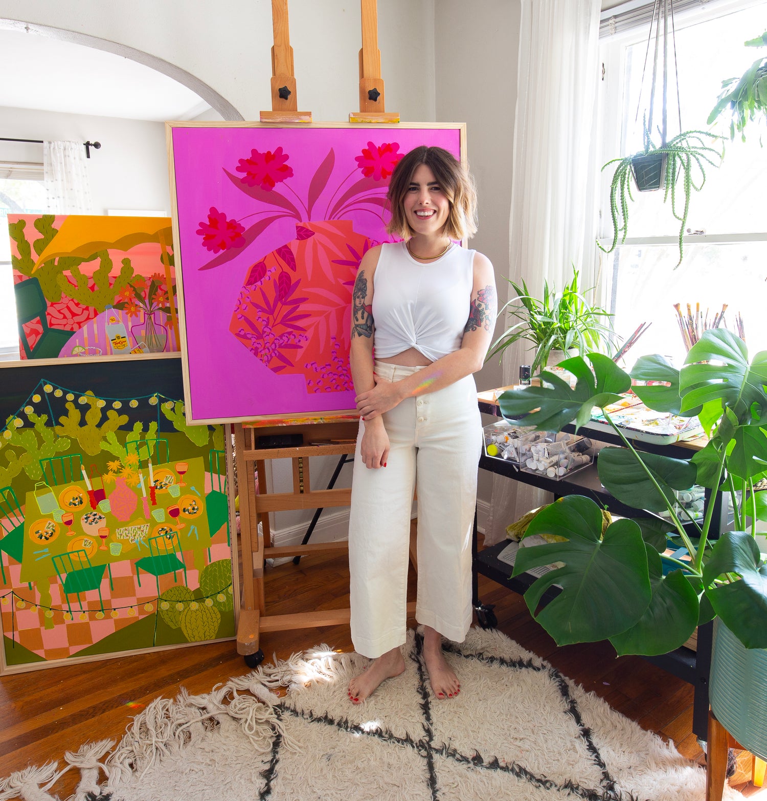 Bailey Schmidt is a painter living and working in Charlotte, North Carolina. Her paintings are full of bold color and pattern and highlight her love of florals and interiors. She likes to challenge herself with unexpected color combinations and unconventional pattern mixing while keeping a critical eye on composition and visual balance. She wants her work to be known for being cheerful and bringing joy to a space.