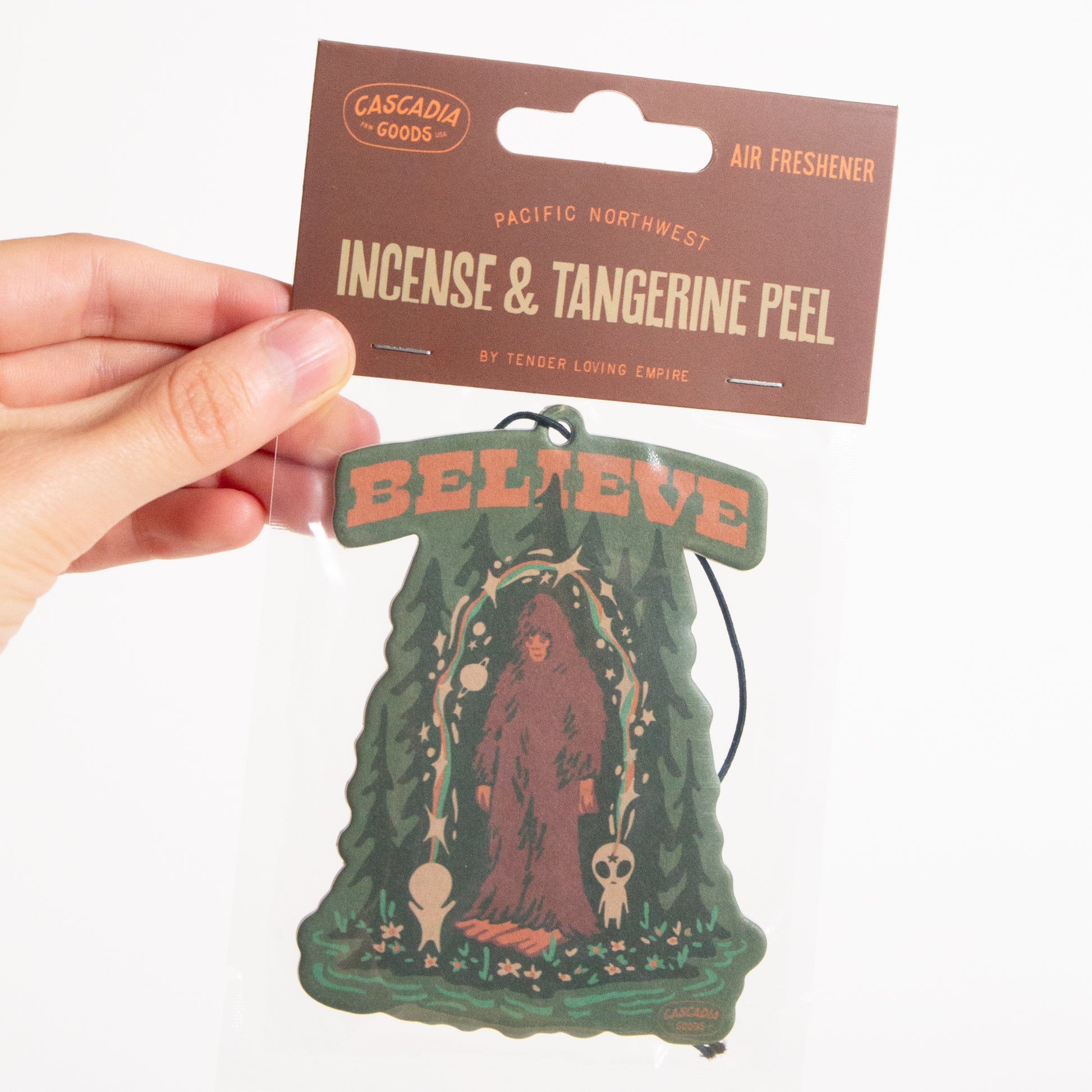 Incense & Tangerine Peel scented hanging car air freshener.