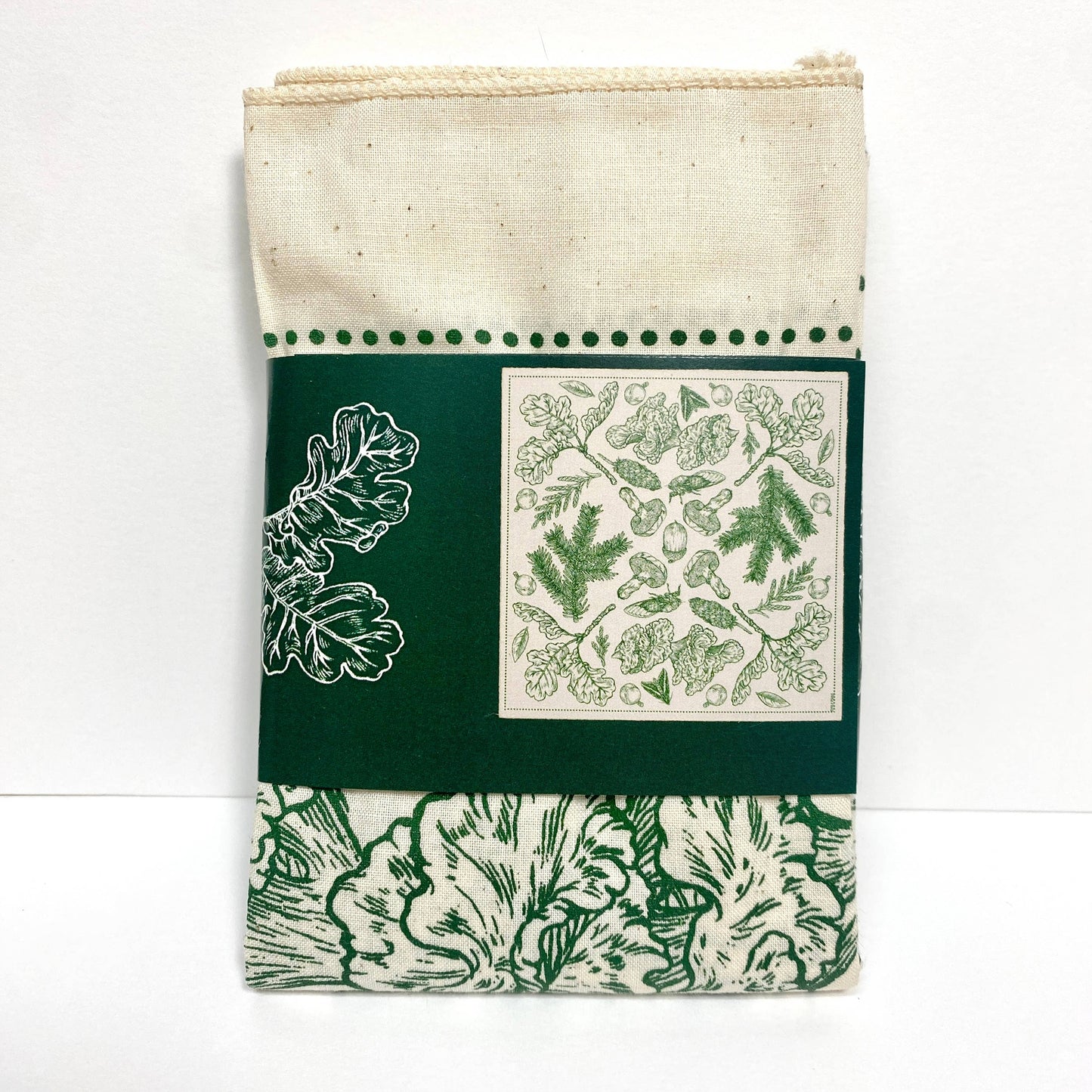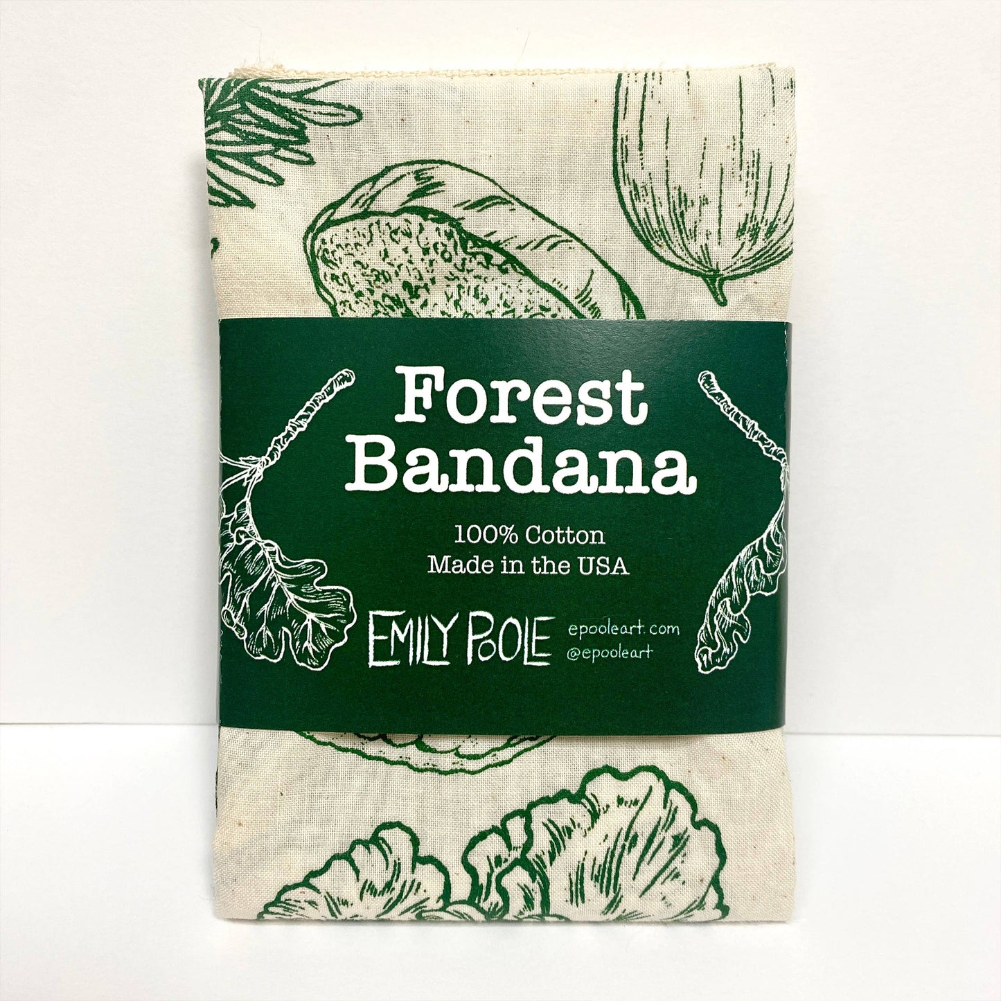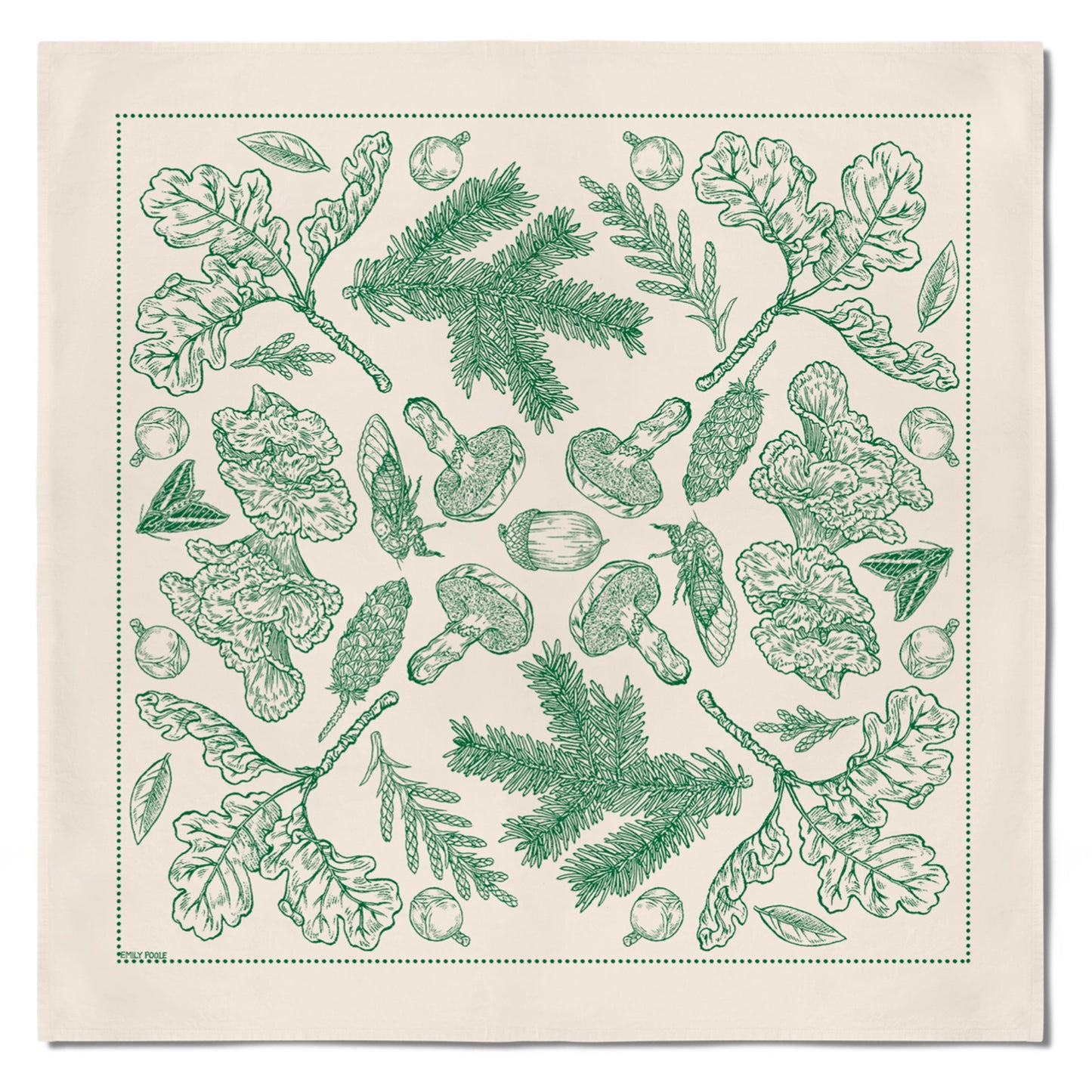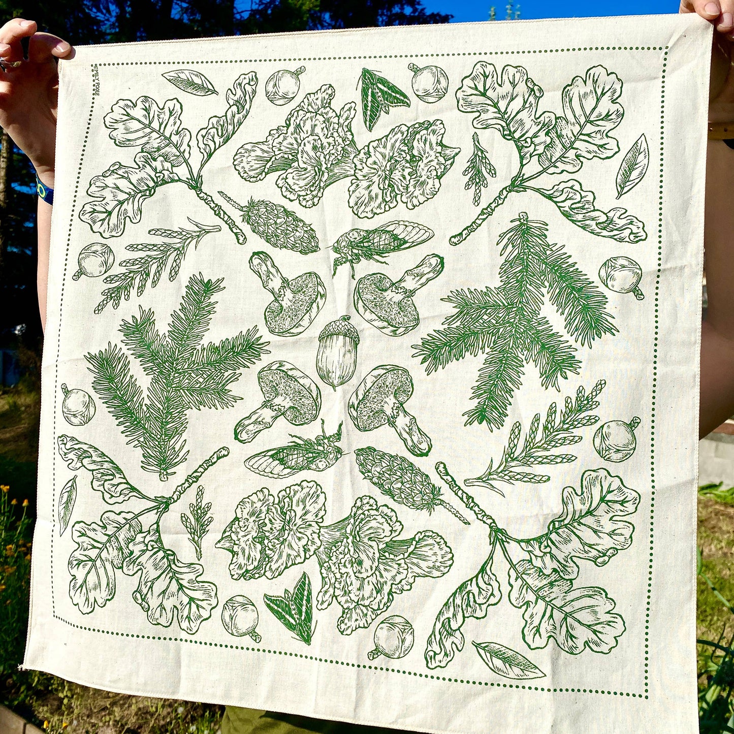 This natural tone bandana features a dark green print of critters, fungi, and plants of the Pacific Northwest.