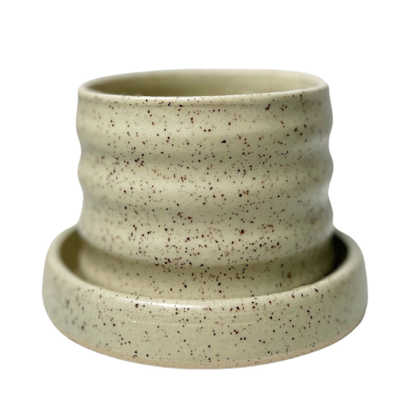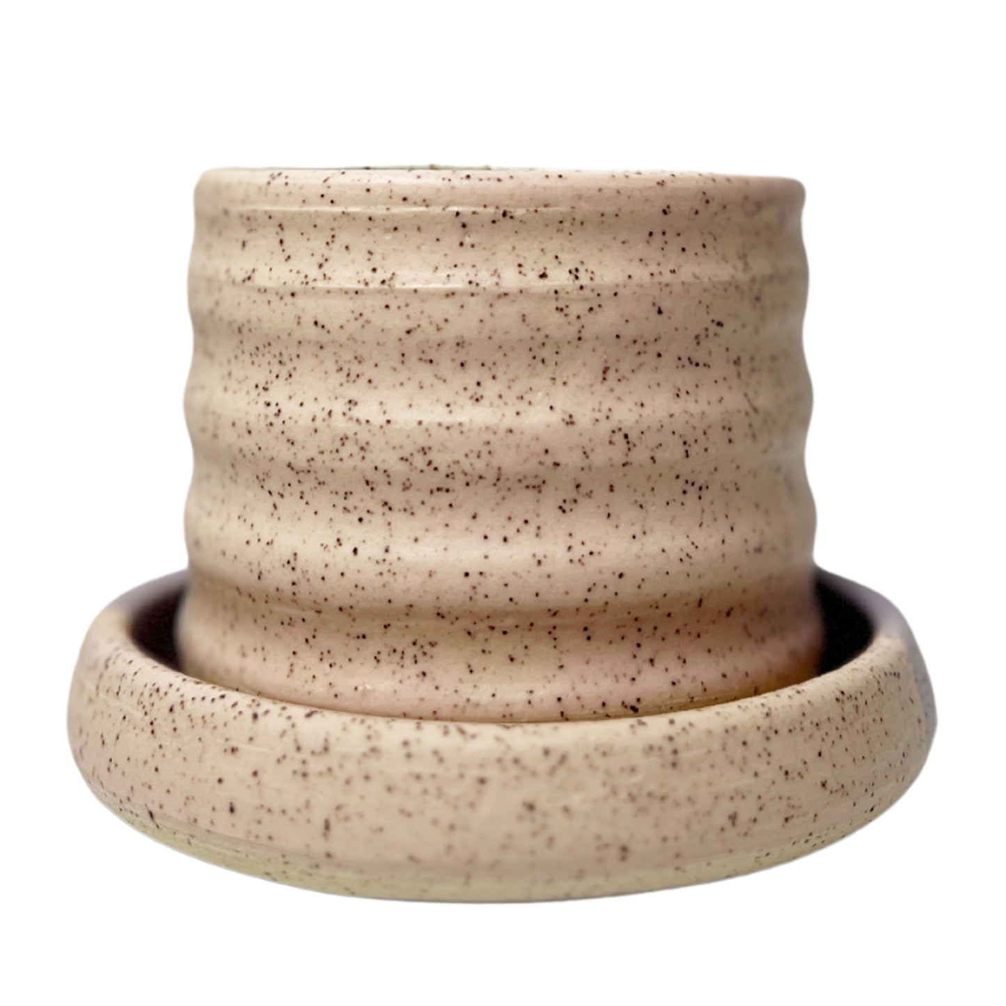 Features a handmade planter pot with a a whole for draining water and a base plate to catch it.