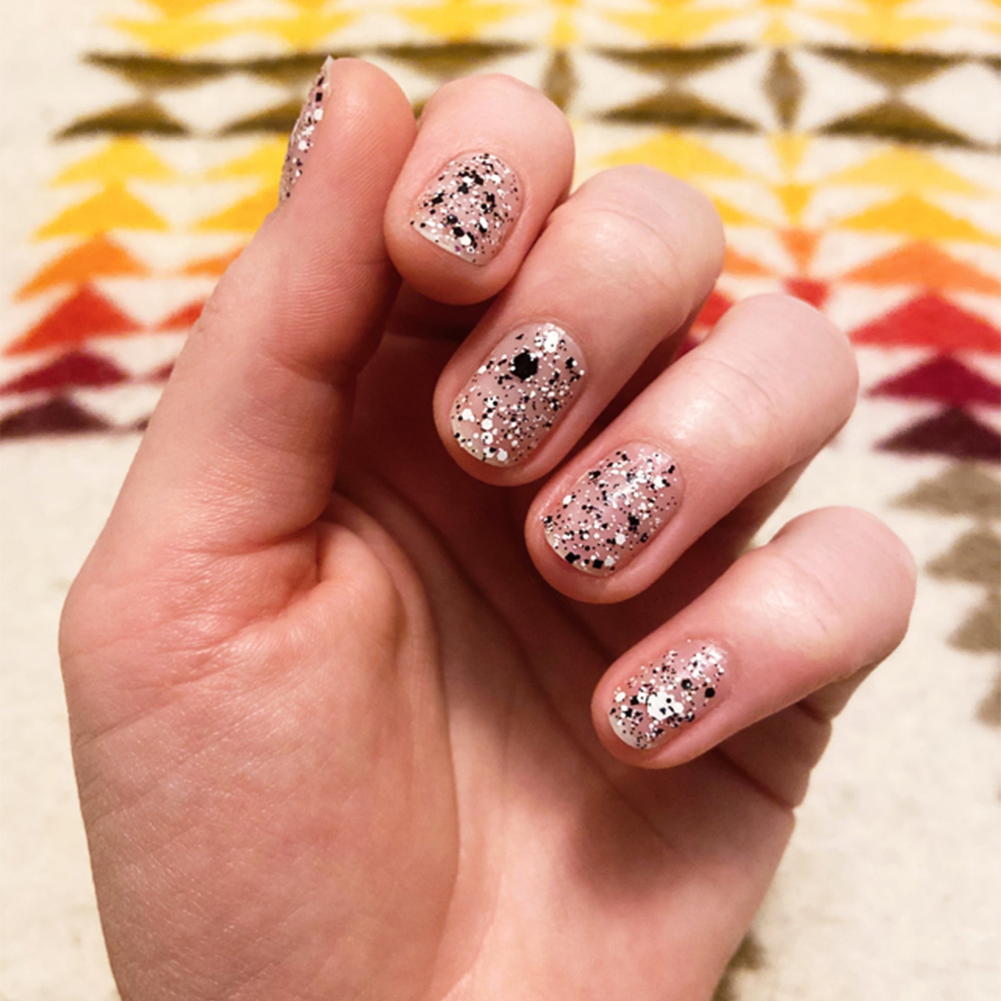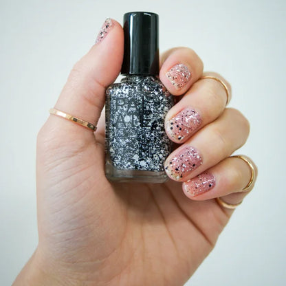 Cookies & Cream is a chunky black & white glitter suspended in clear coat.