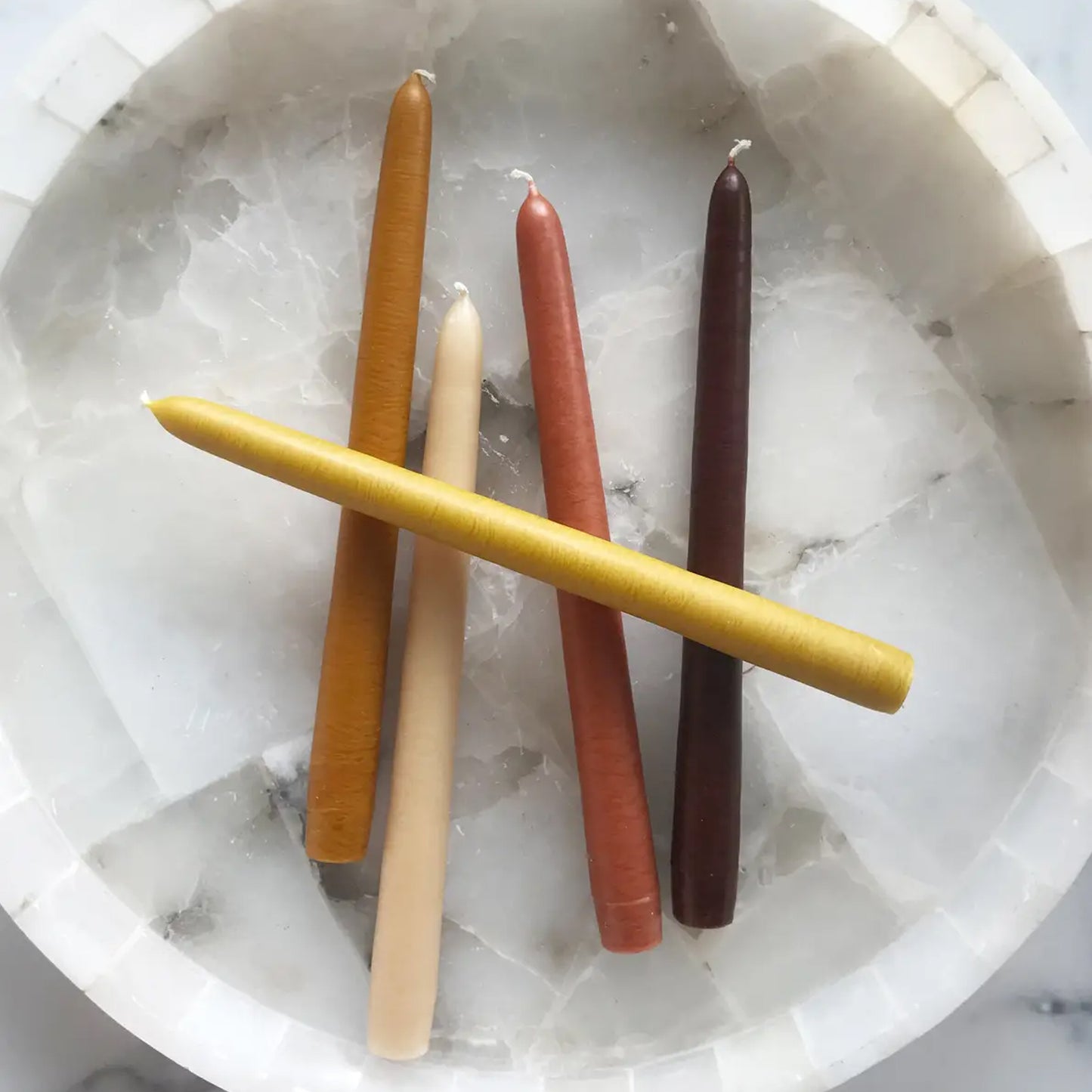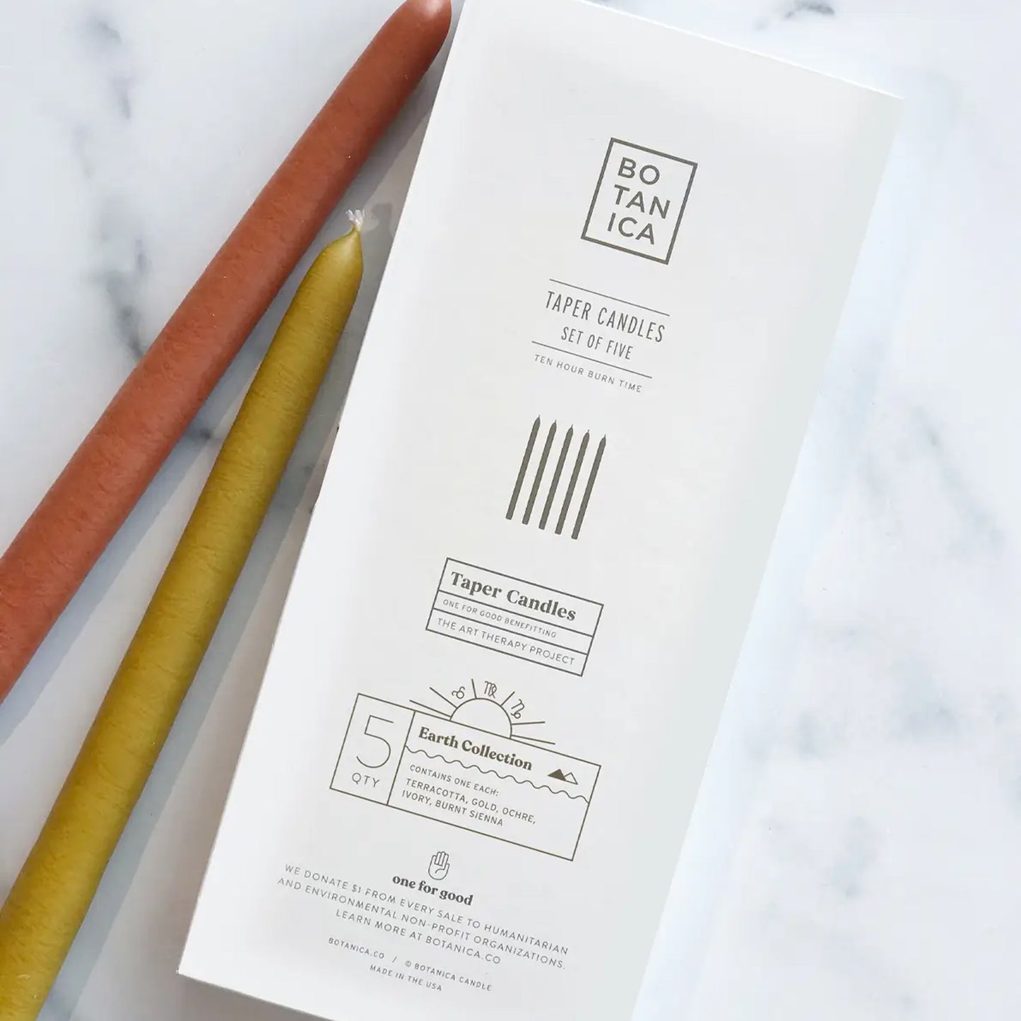 Botanica taper candles are dipped over 20 times by hand, creating the ideal taper–dripless and smokeless–perfect for dinner parties and creating warm, homey ambiance. Our Zodiac Tapers are slightly textured for a handmade finish, and beautifully dyed in an array of shades reflecting the Elemental Collection.