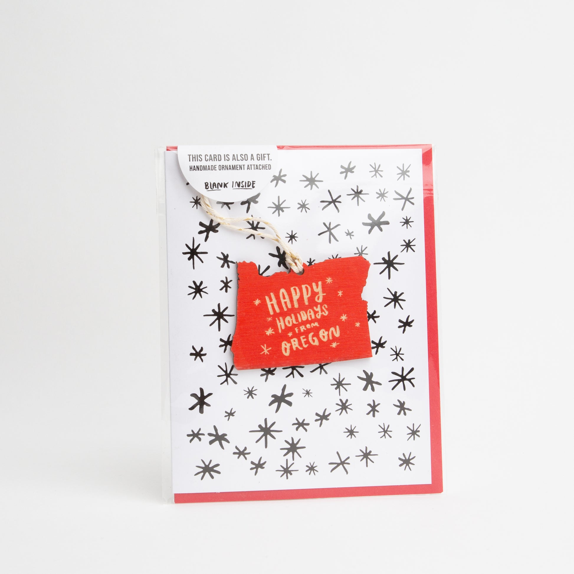 Spread the Oregon love far and wide with a handcrafted ornament attached to the front of a greeting card.