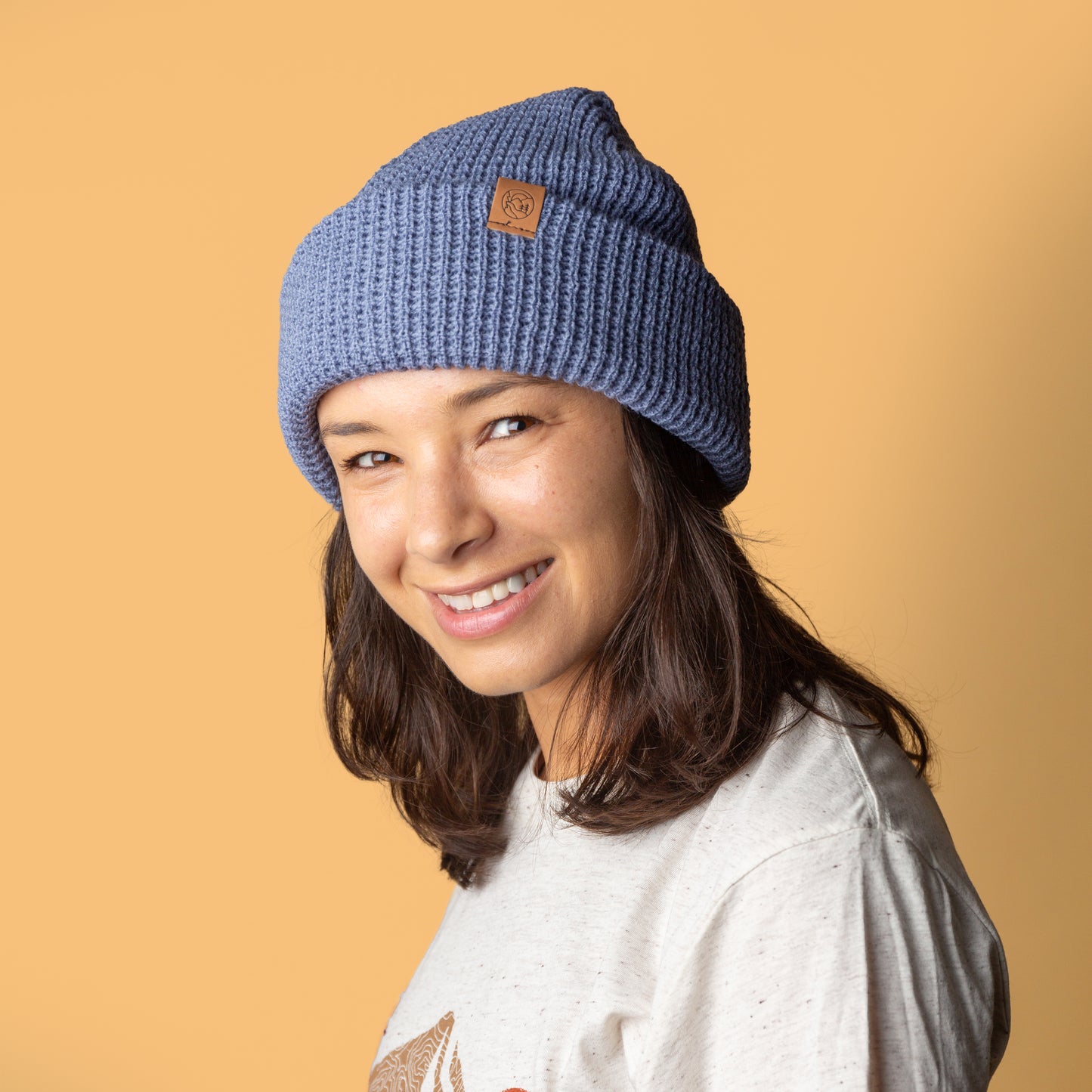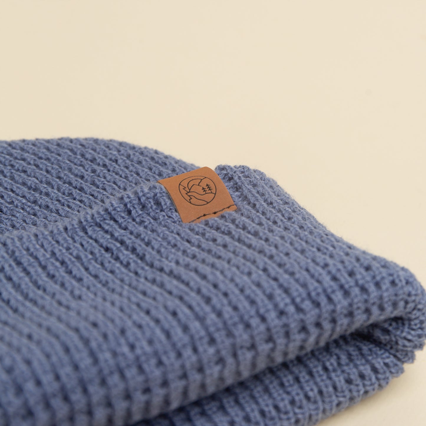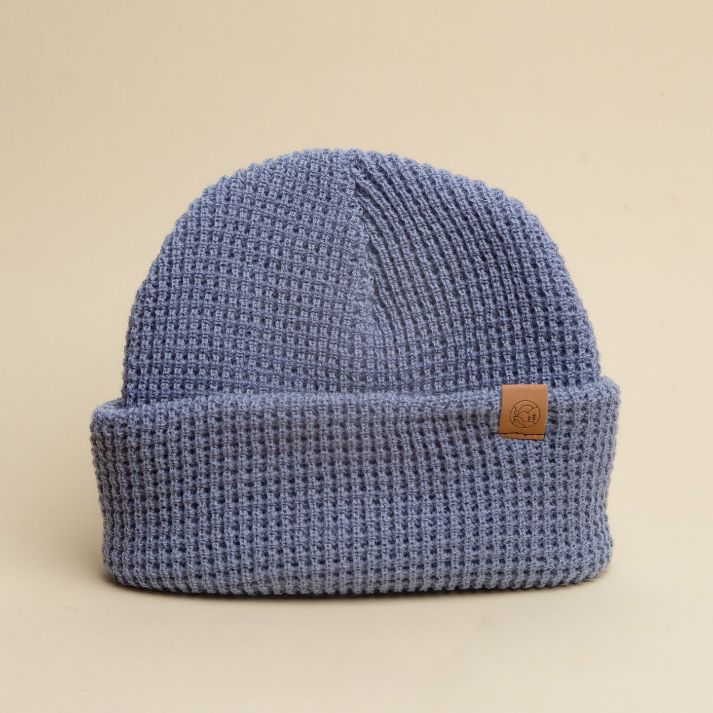 Waffle cuff beanie, embossed on a vegan leather tab. 100% USA made.