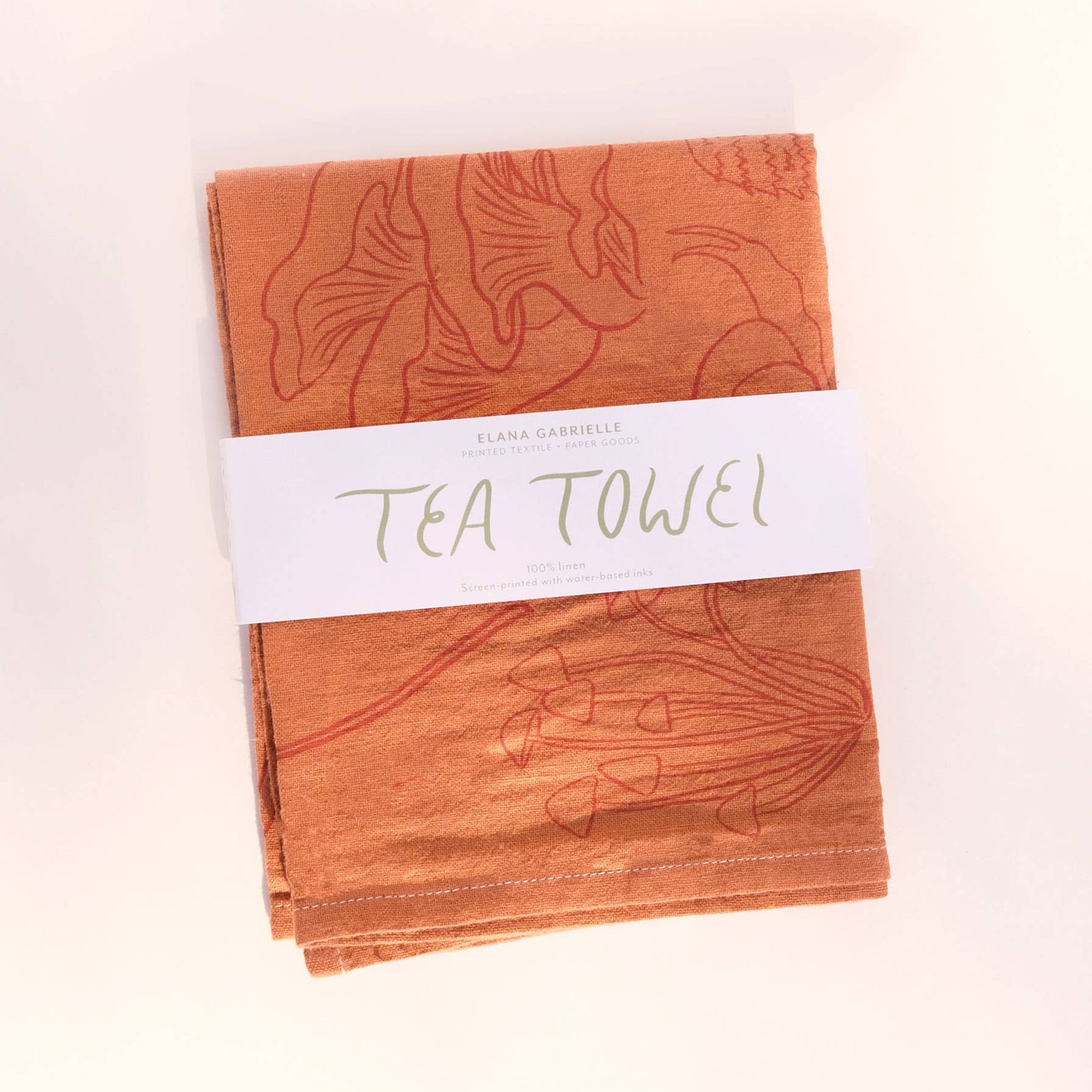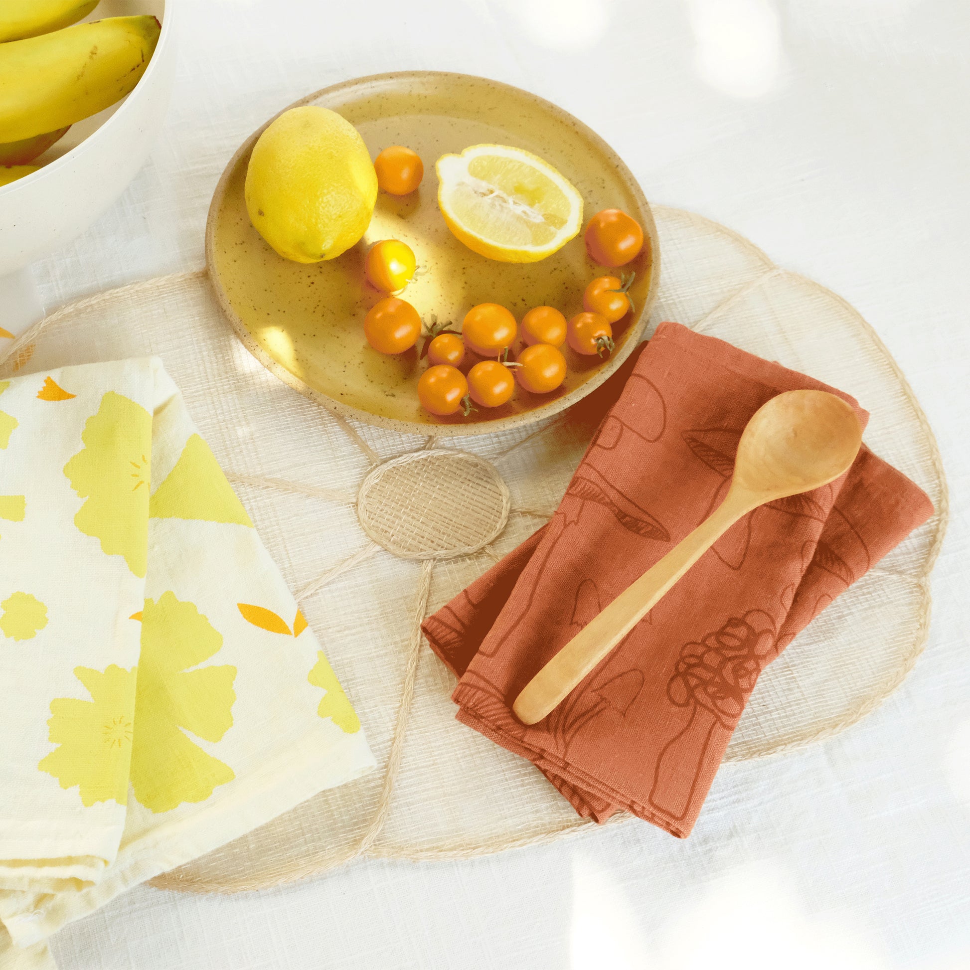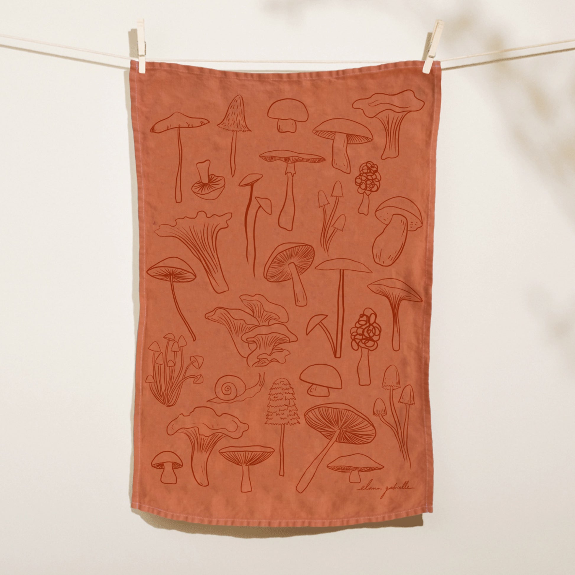 The Mushrooms Tea Towel is inspired by mossy forest walks, loamy soil, and mushroom season meals.