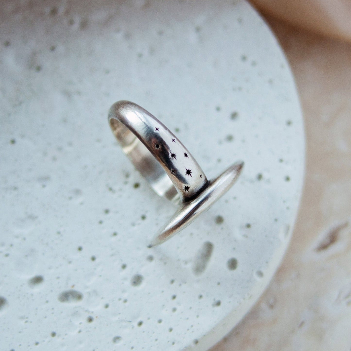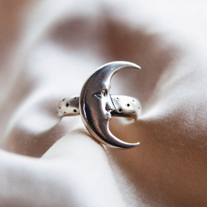 Presenting the Nocturne Ring -- a dreamy vintage style moon sits perched on a ring band adorned with stars on each side. Crafted with utmost care and attention to detail, this piece is available in solid .925 sterling silver.