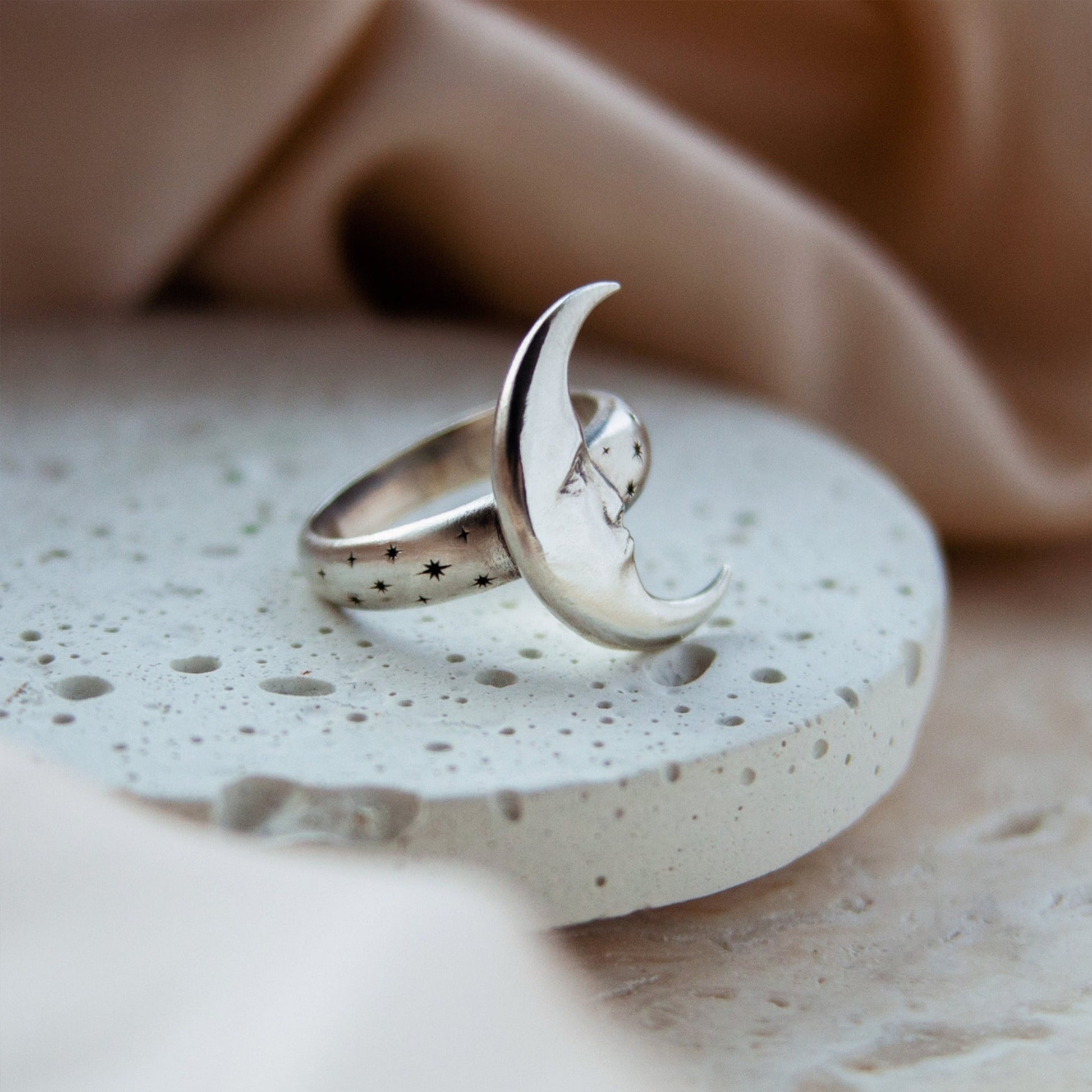 Size Information: Moon is about 22mm from top to bottom of crescent. Moon face is about 10mm wide at widest point of face. Ring band is about 6mm wide at widest point.
