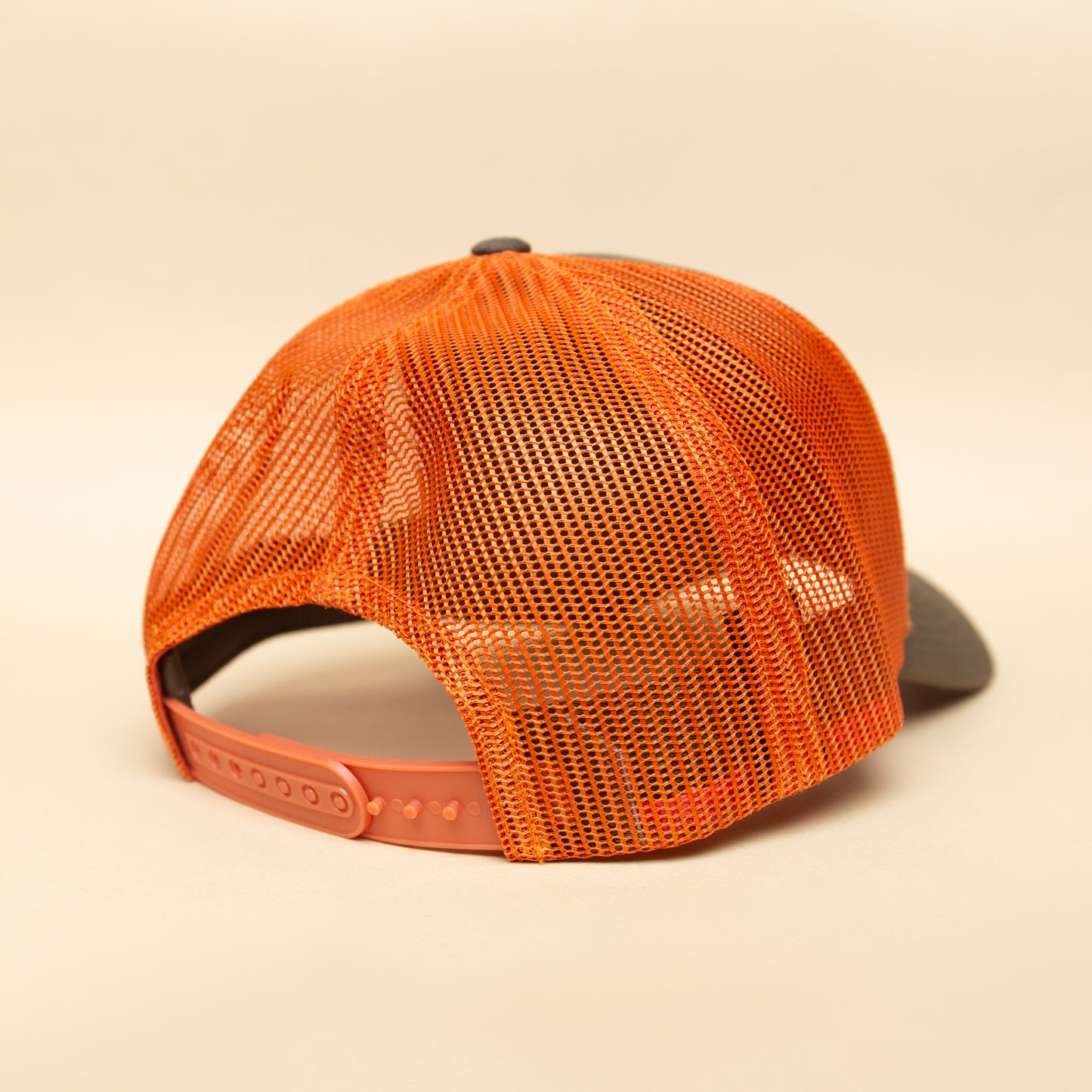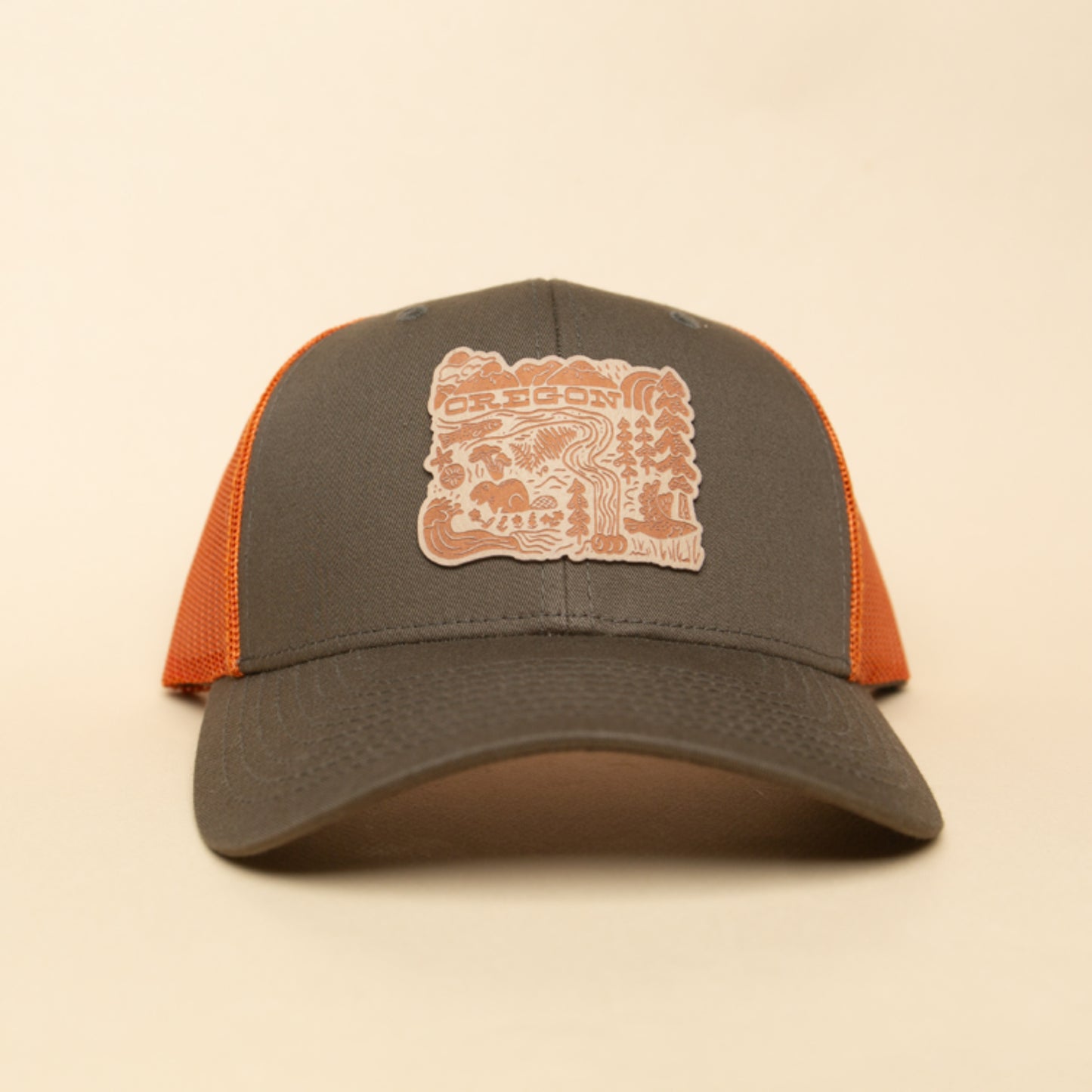 A cotton twill based custom trucker hat with a pre-curved visor, classic snapback, and a vegan / faux leather patch.