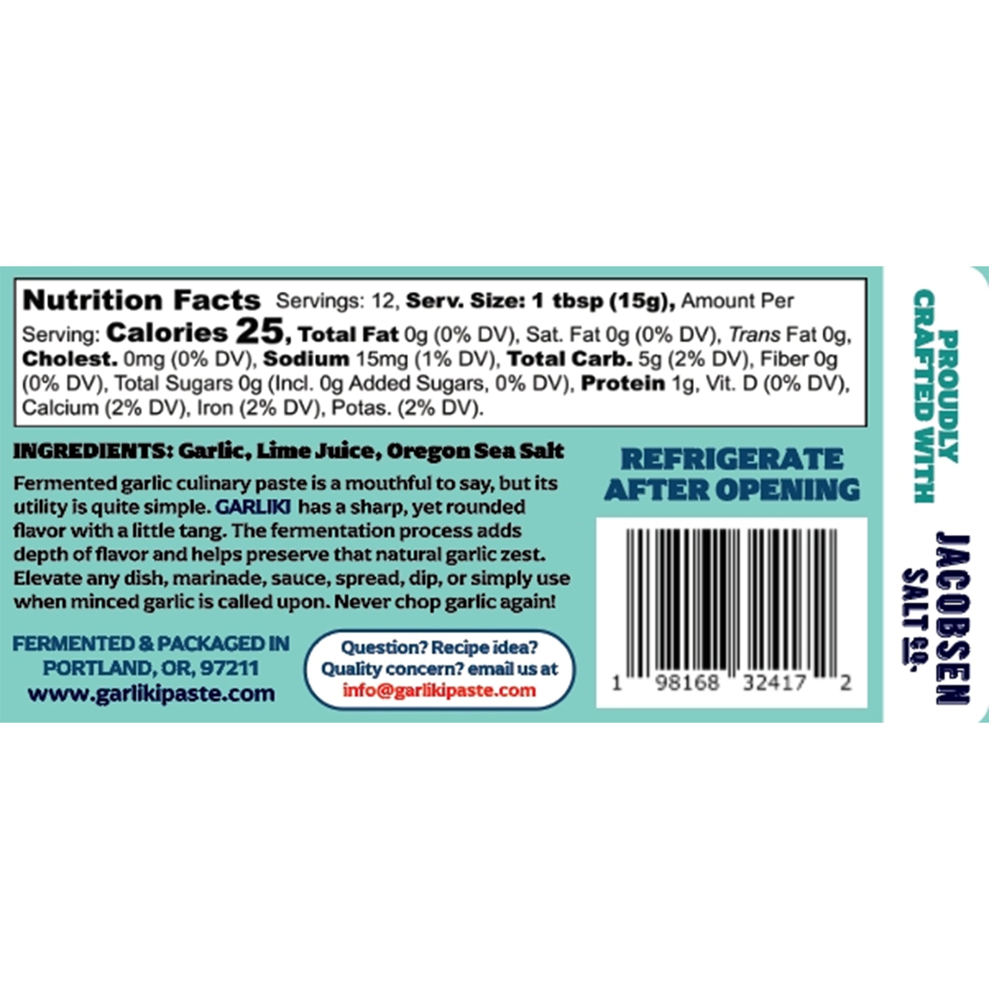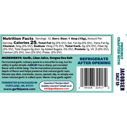 With our "Original" recipe, a profound flavor that is achieved by employing just three simple ingredients: USA grown garlic, Jacobsen Oregon sea salt, and lime juice. The unique fermentation process adds a distinct depth of flavor to the familiar pungency of garlic, and a rounded "zing" that works well in any cuisine. Implement anywhere in the kitchen where minced garlic is called upon, and beyond.