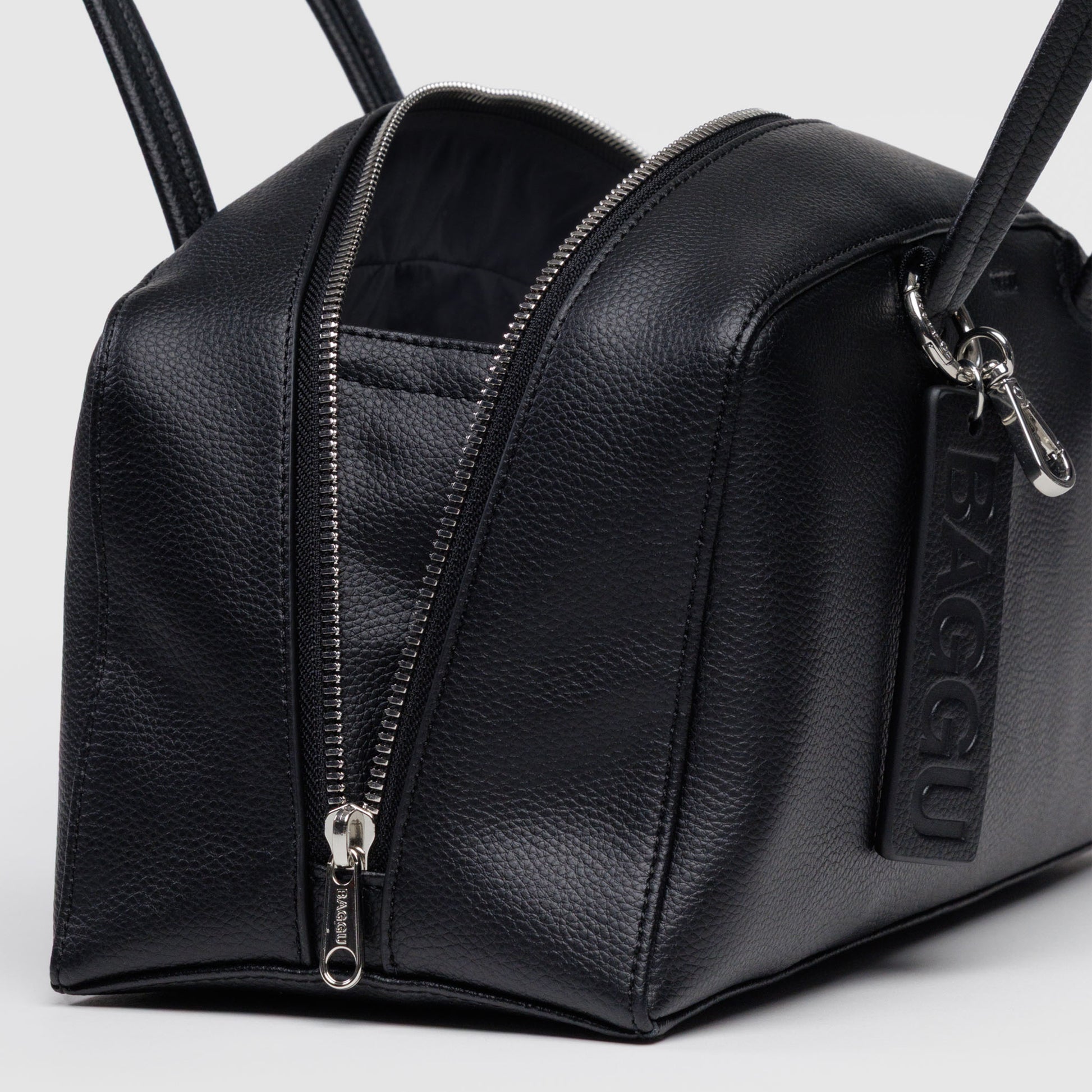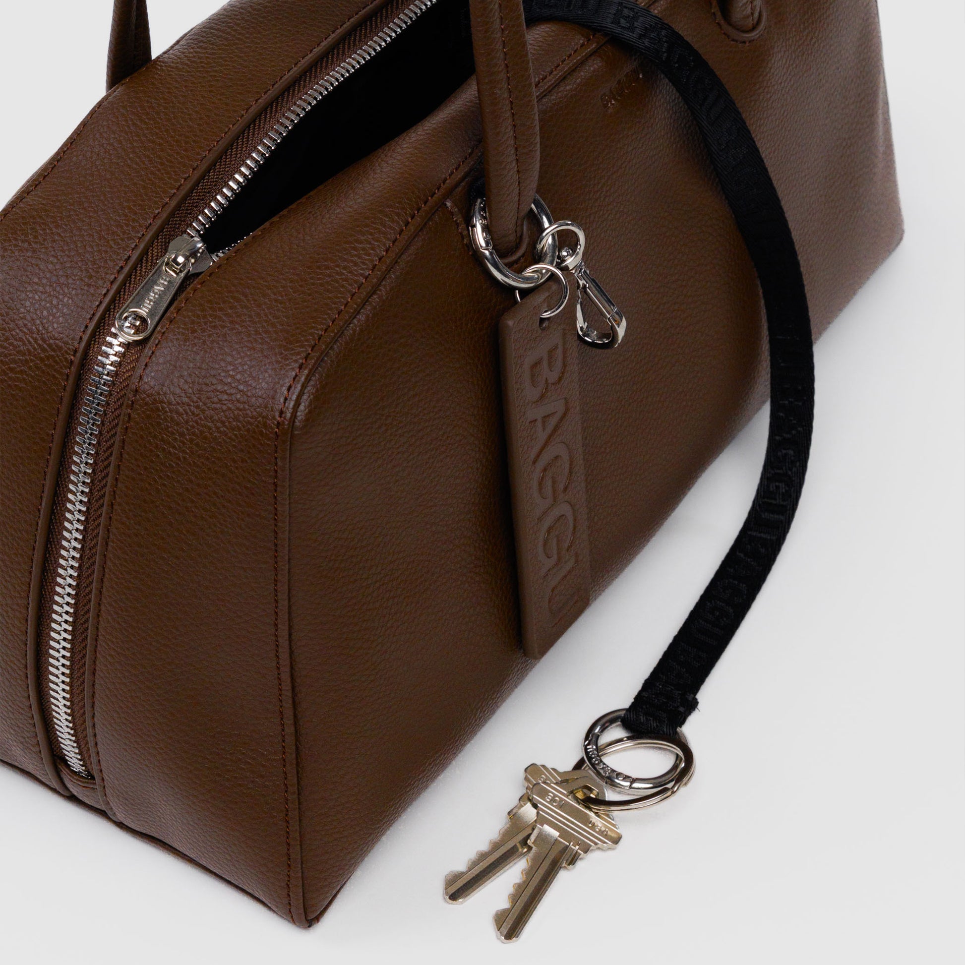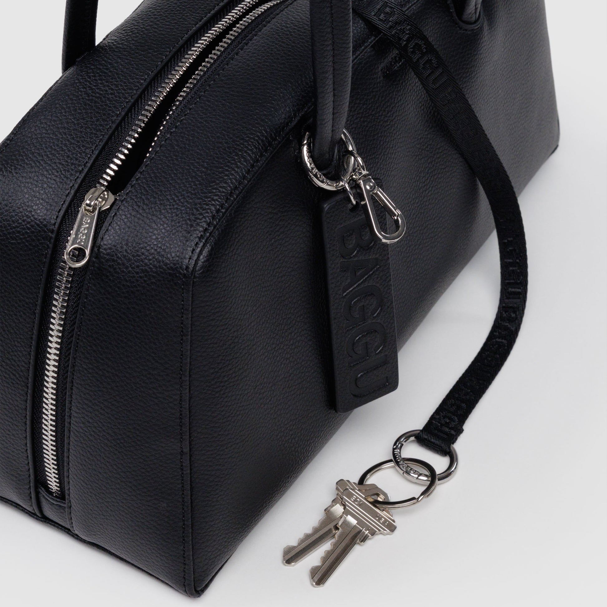 A recycled leather bowler bag designed to be accessorized, with four charm loops and a clip ring. An interior zip pocket keeps things secure and in reach. Extra room fits your book, phone, wallet, keys, and more.