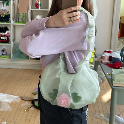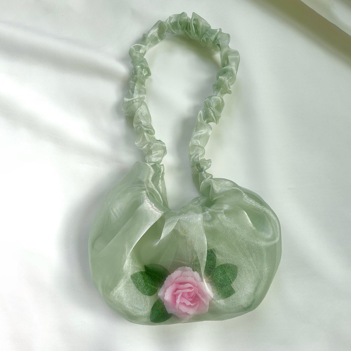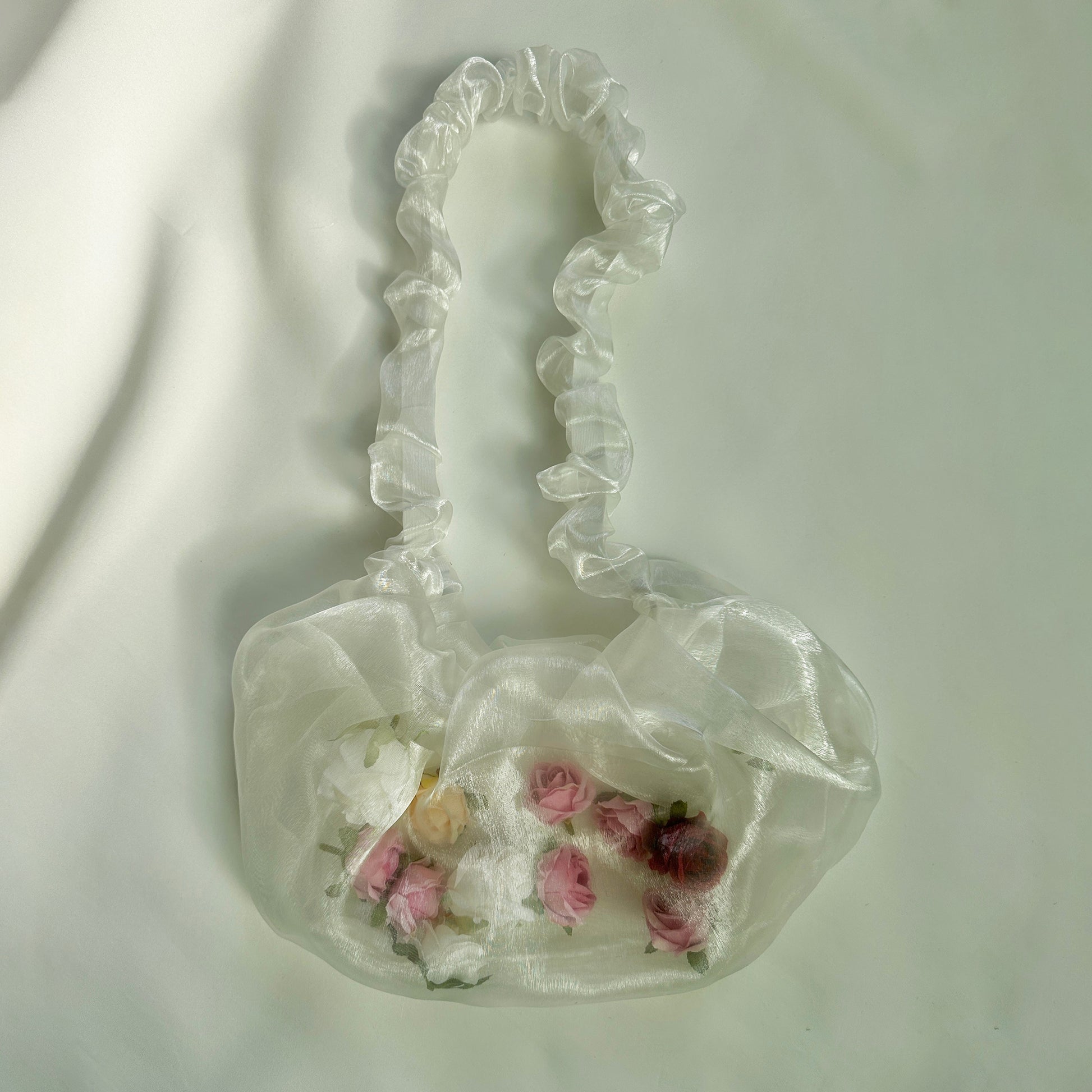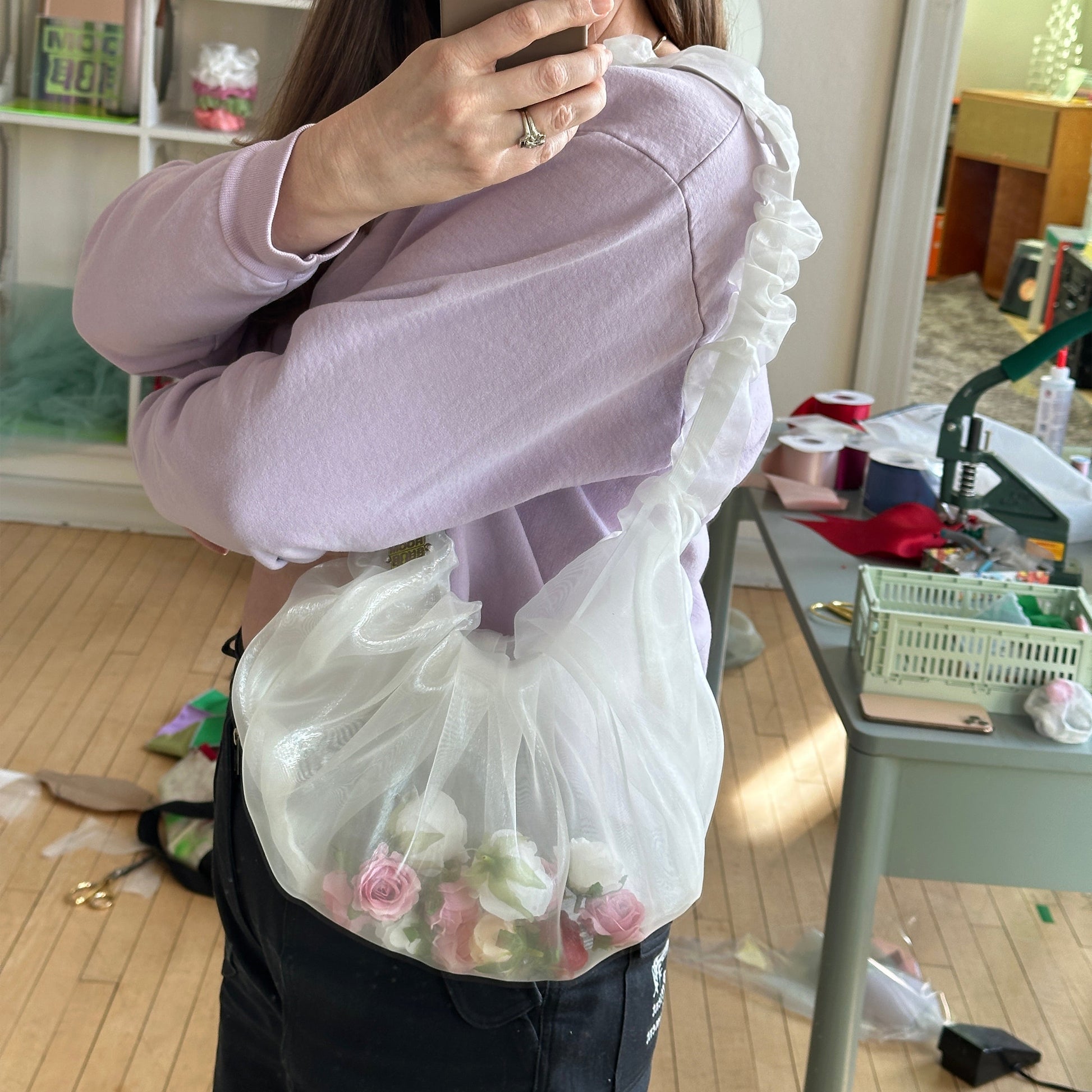 Sheer rose filled Organza Crossbody Bag with fully elasticized handle that allows for larger arm hole as needed! Bounces as you walk.