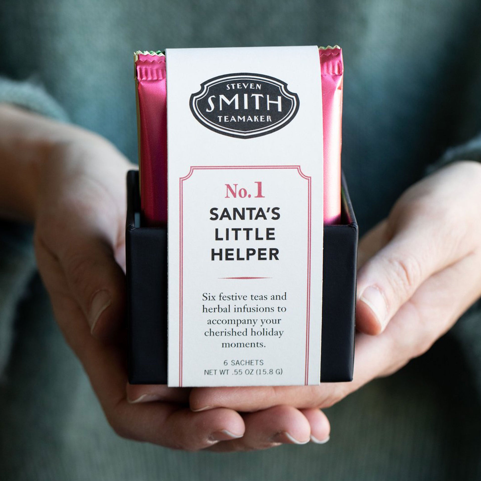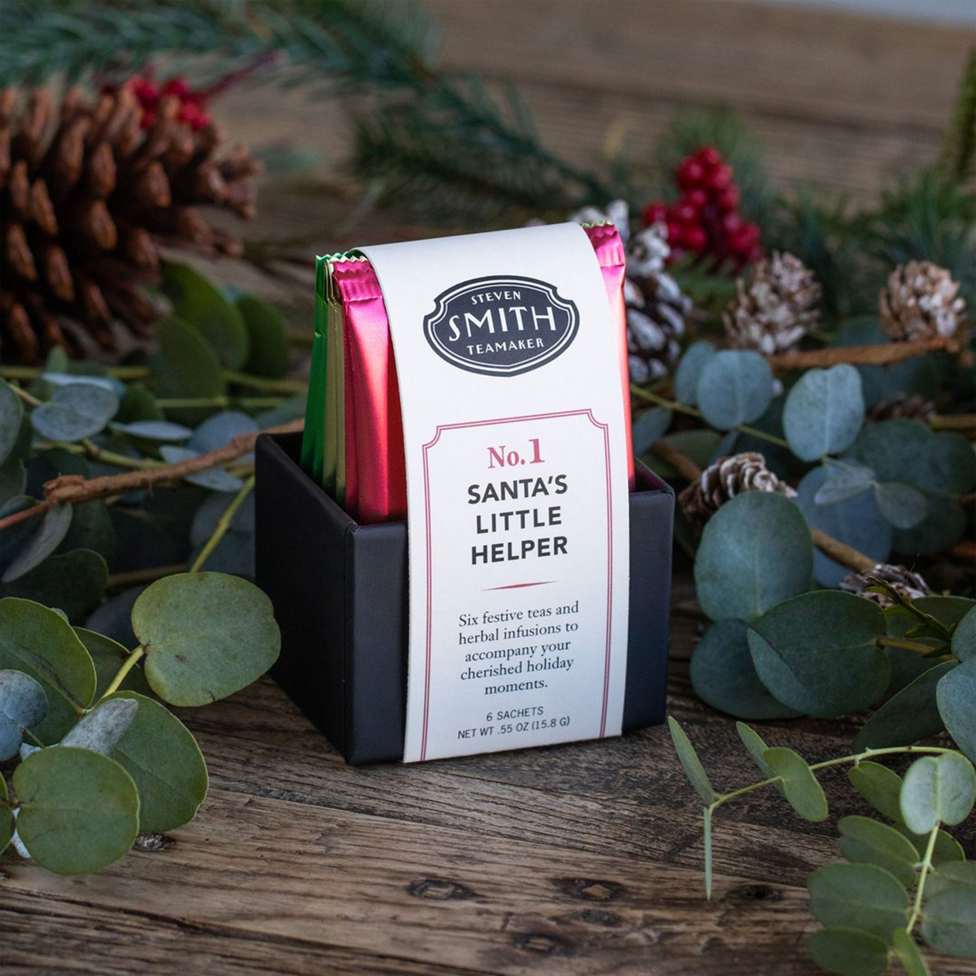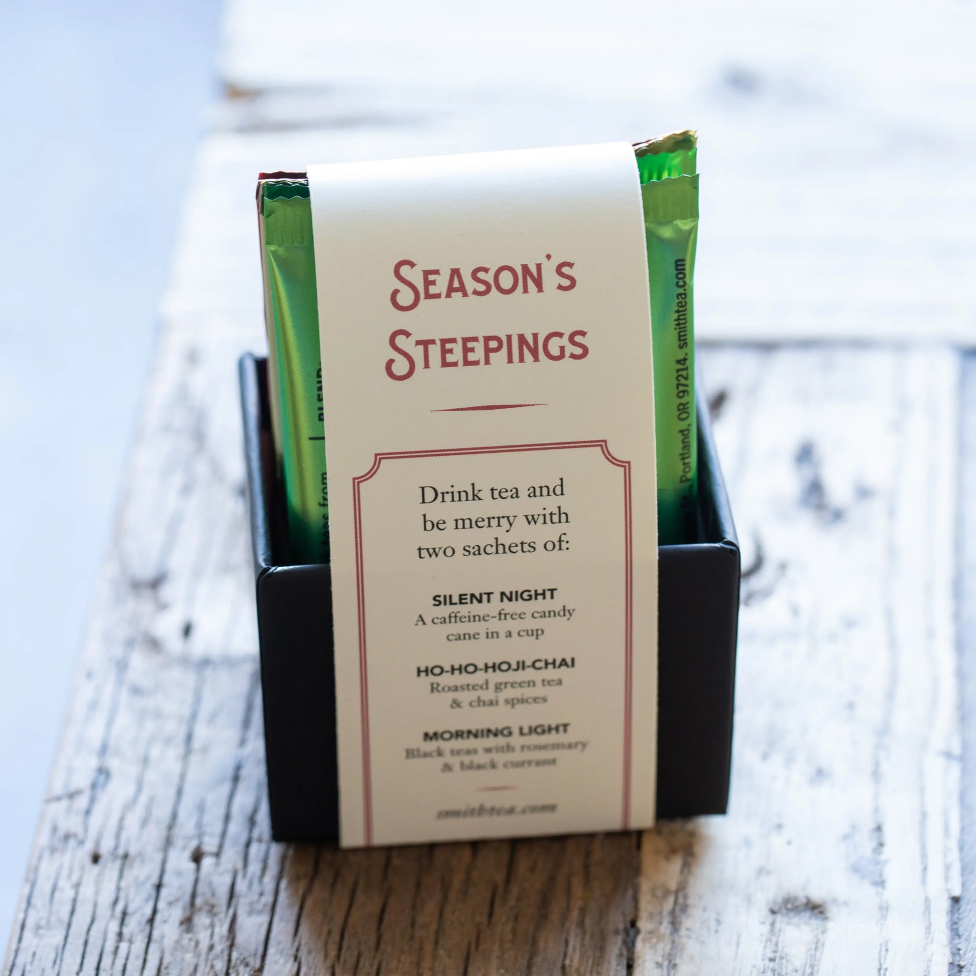 Six plant-based sachets and a sleek black caddy. Assortment includes two sachets each or Silent Night Herbal Infusion, Morning Light Black Tea, and Ho-Ho-Hoji-Chai Roasted Green Tea.