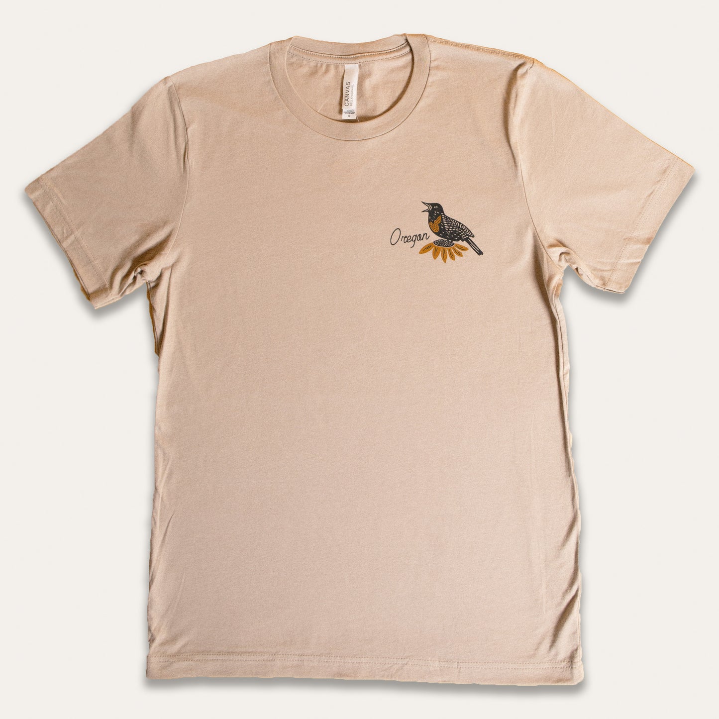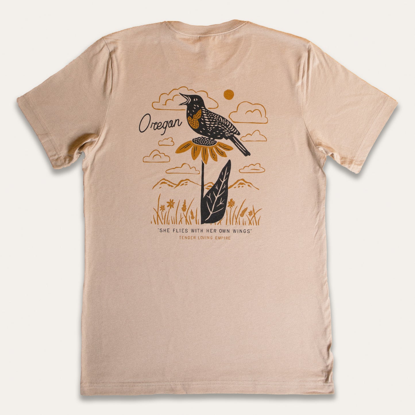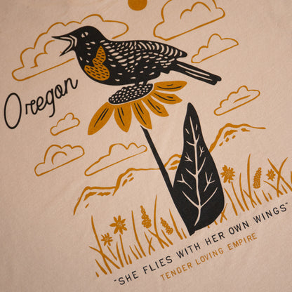 Celebrate Oregon's state motto "She Flies with Her Own Wings" with this bright retro shirt design. Printed on a 100% combed ring-spun cotton shirt.