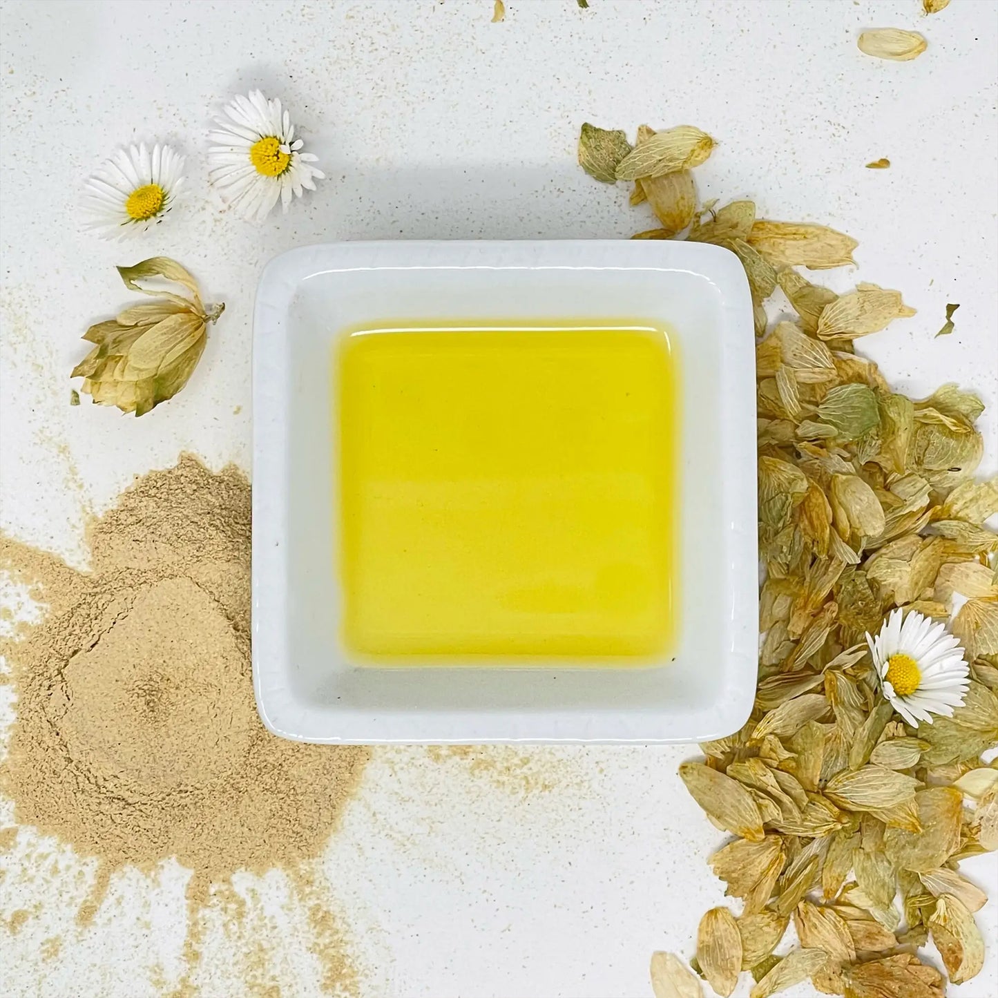 Ingredients: Organic sunflower and organic sesame oils infused with lemon balm, (gf) hops, skullcap, chamomile, valerian root, ashwagandha, and passionflower.