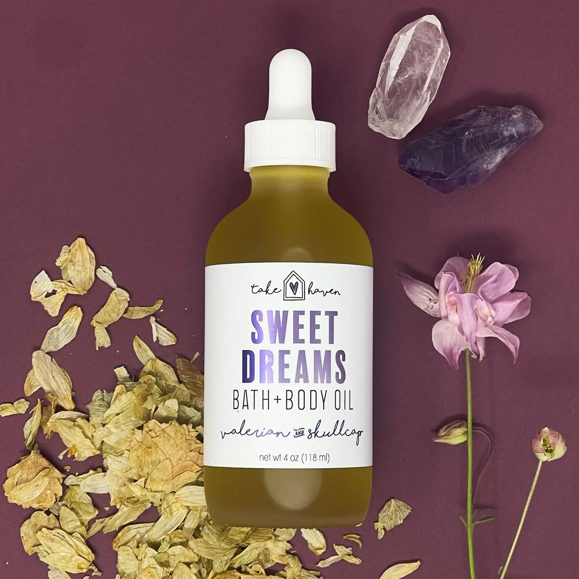 Unleash serenity with Sweet Dreams, a tranquil bath and body oil intentionally formulated to promote relaxation and a restful night’s sleep. Sweet Dreams combines the soothing properties of organic oils with a synergistic blend of botanicals and steam-distilled, therapeutic-grade essential oils. These select ingredients are known to support relaxation, reduce anxiety and restlessness, alleviate insomnia, and improve sleep quality, supporting a peaceful night's rest.