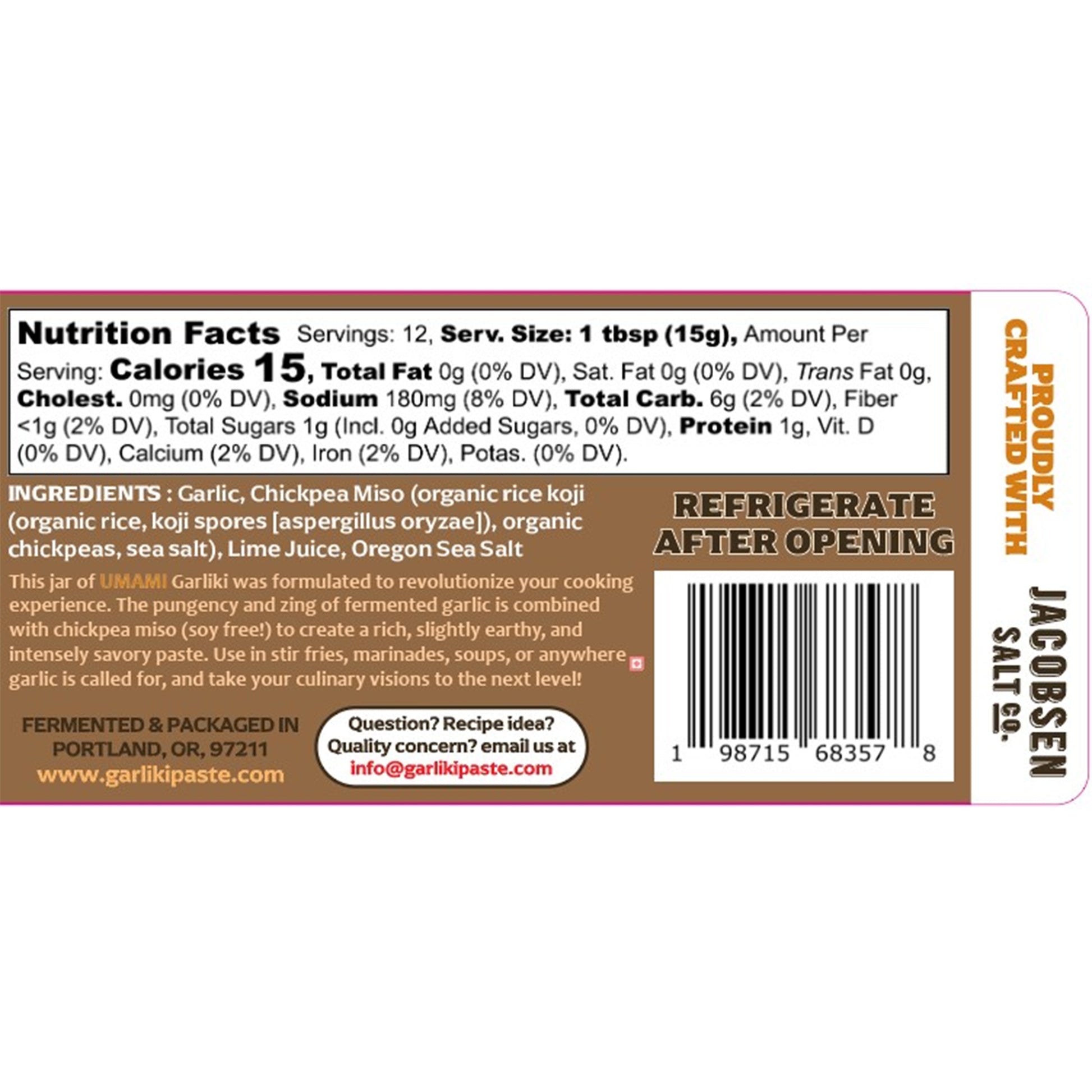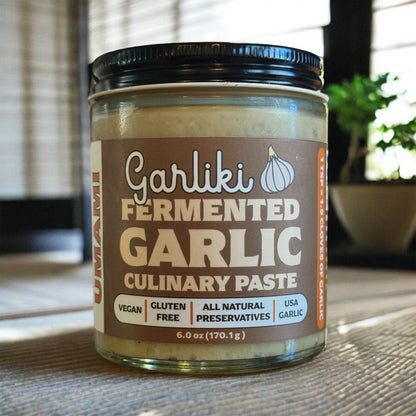 This jar of UMAMI Garliki was formulated to revolutionize your cooking experience. The pungency and zing of fermented garlic is combined with chickpea miso (soy free!) to create a rich, slightly earthy, and intensely savory paste. Use in stir fries, marinades, soups, or anywhere garlic is called for, and take your culinary visions to the next level!
