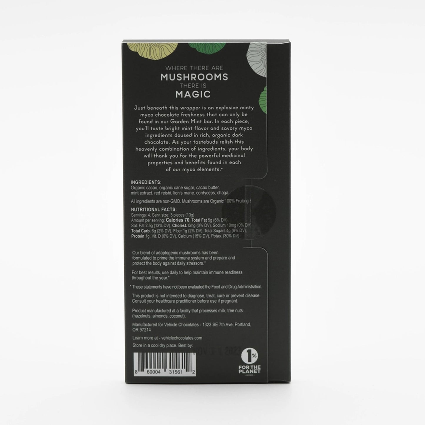 Experience the minty myco chocolate freshness only found in our garden mint bar. In each piece, you'll get a blast of fresh bright mint, doused in rich dark chocolate. As your tastebuds bask in the heavenly flavors, your body with thank for for the powerful addition and boost from our myco mushroom additions.