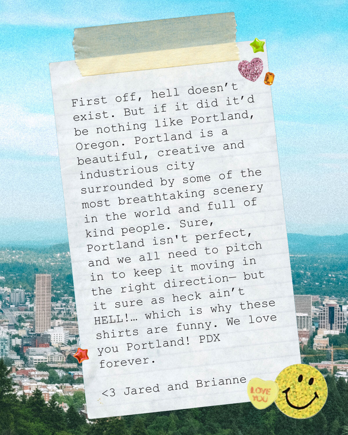 First off, hell doesn’t exist. But if it did, it’d be nothing like Portland, Oregon. Portland is a beautiful, creative and industrious city surrounded by some of the most breathtaking scenery in the world and full of kind people. Sure, Portland isn't perfect, and we all need to pitch in to keep it moving in the right direction— but it sure as heck ain’t HELL!… which is why these shirts are funny. We love you Portland! PDX forever. <3