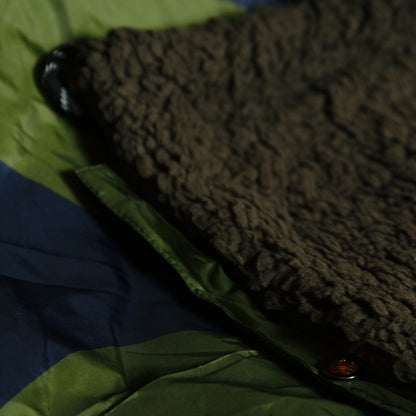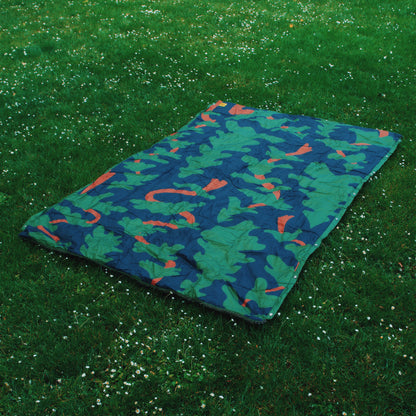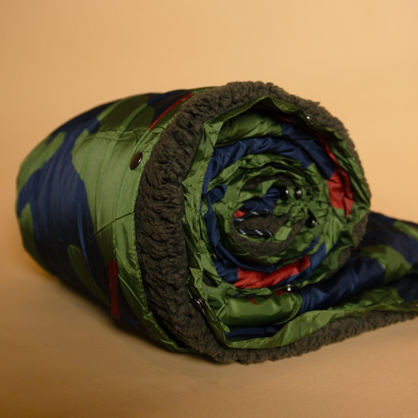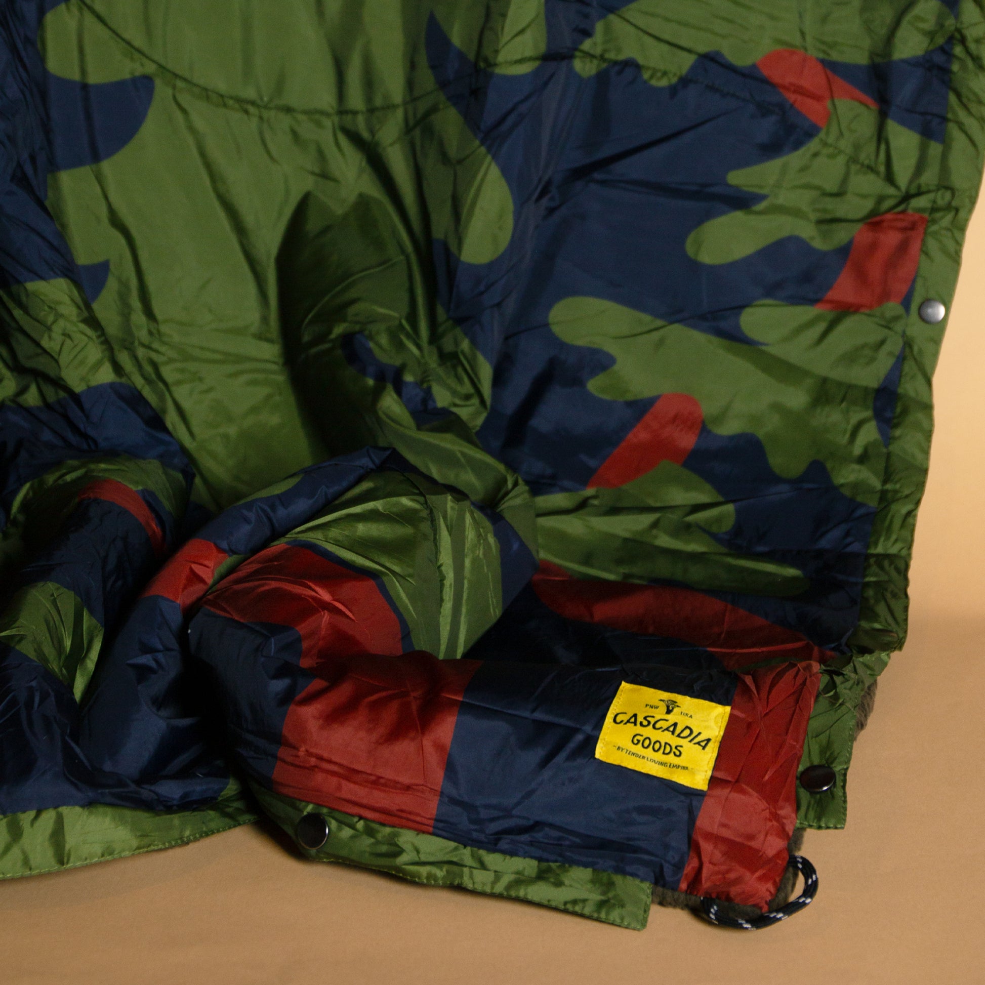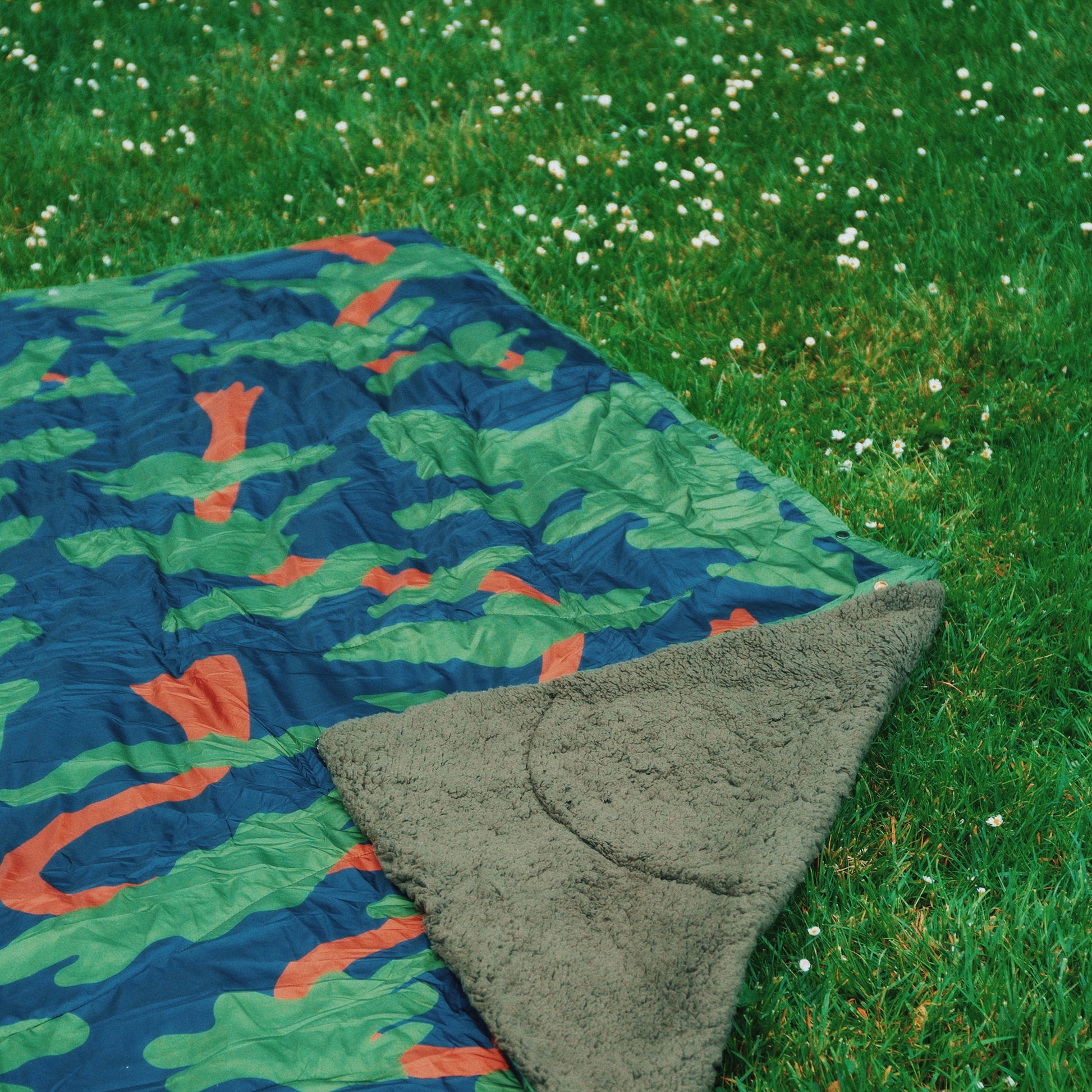 54"L x 80"W ripstop camping blanket made with warm berber fleece lining and soft polyester outer. Features corner loops for hanging or staking and comes in a polyester bag for easy packability.